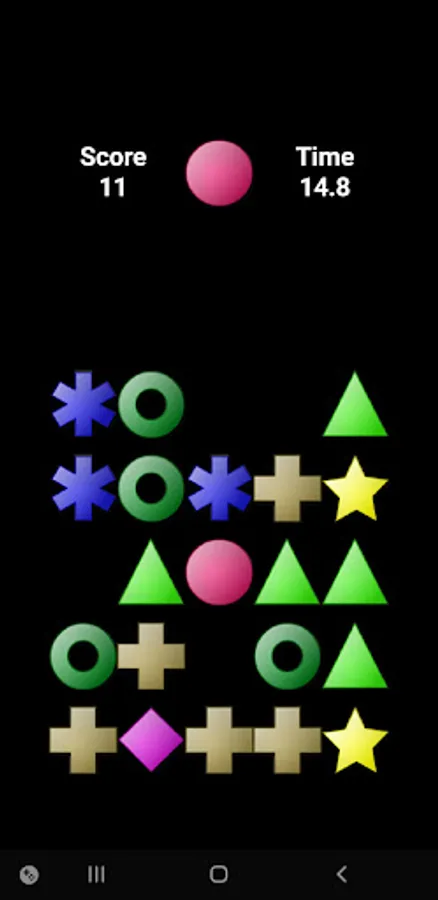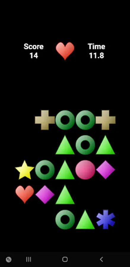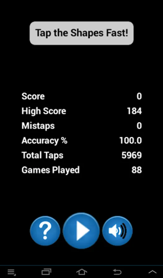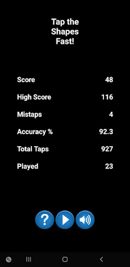 You have 20 seconds to tap as many of the correct shapes as you can. You gain 0.1 seconds for each correct shape tapped, awarded when the board is cleared of the target shape. Stats reported are Score, High Score, Total Taps, Games Played, number of Mistaps for that game, and Accuracy percent for that game.