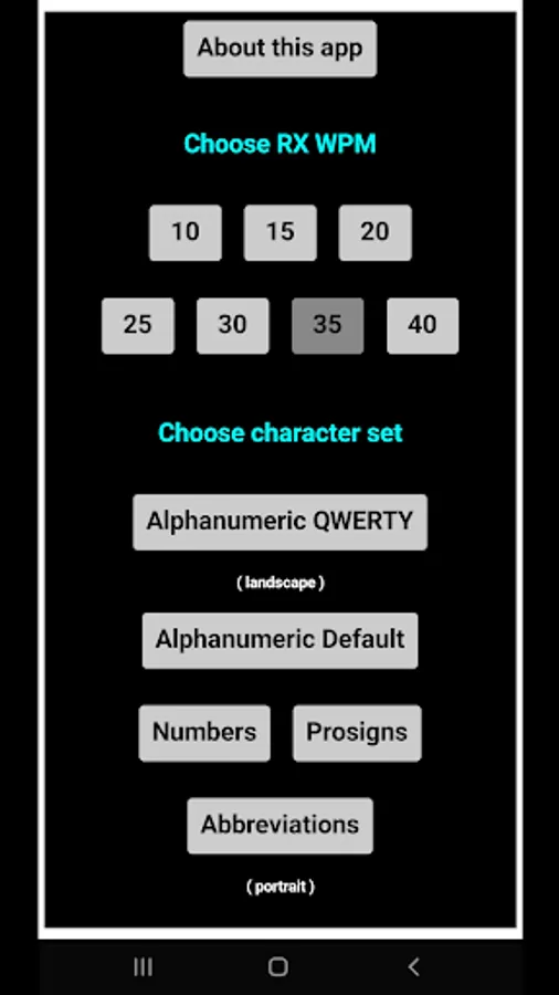 This Morse code CW learning Android app is RX only at 10, 15, 20, 25, 30, 35, and 40 WPM and focuses on listening to Morse code rather than visually learning dots and dashes. It does not interface with your radio gear. If you wish to practice CW Morse code TX, please see KG9E's other amateur ham radio Android apps for Morse code practice.