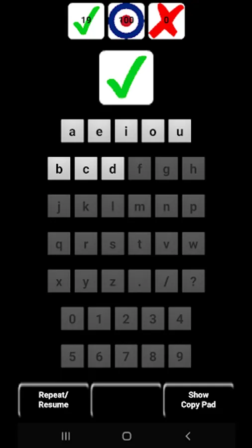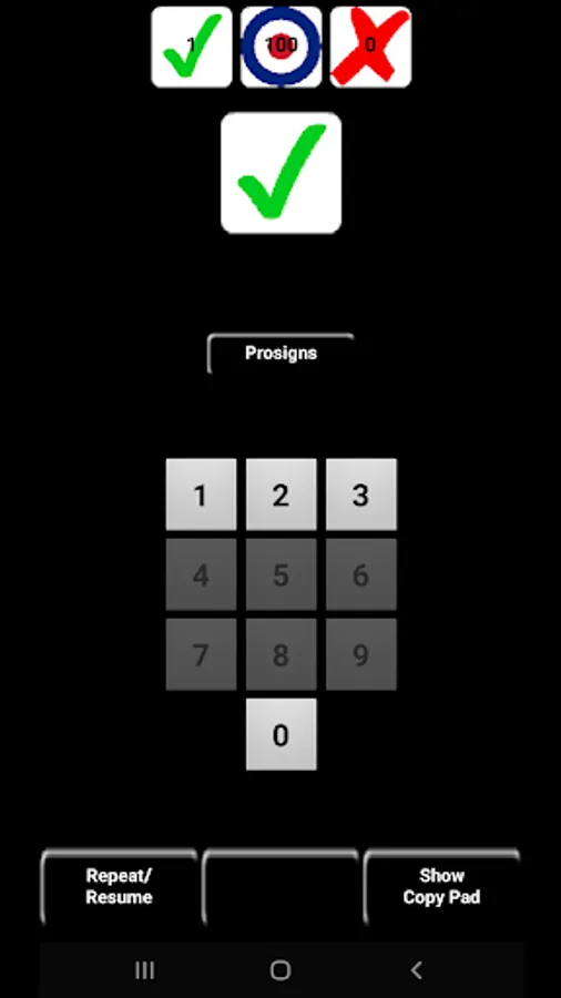 Android plays a character in Morse code and your task is to tap or type the matching character using the app's Default or QWERTY keypad or external USB or Bluetooth keyboard. Once you have learned a character with 90% proficiency, a new character is introduced. You will soon have a large pool of characters from which Android will choose, weighted toward those characters learned with a lower proficiency and those with least exposure before selecting randomly from the pool.
