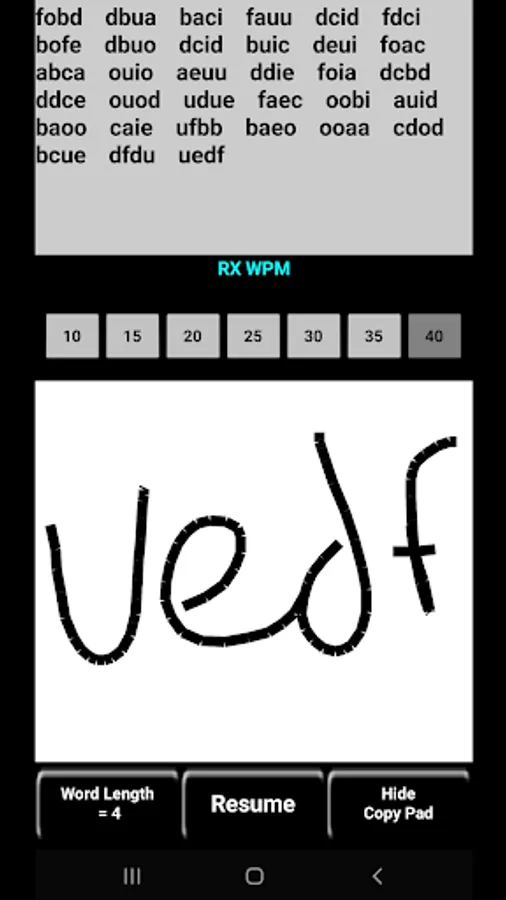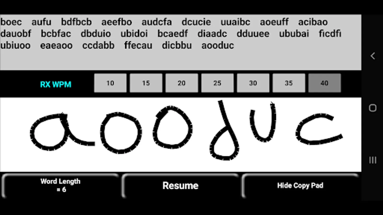 While using the Copy Pad, you are able to receive a string of Morse code characters at various speeds and write in the whitespace with your finger or stylus, or enter the string via external USB or Bluetooth keyboard.