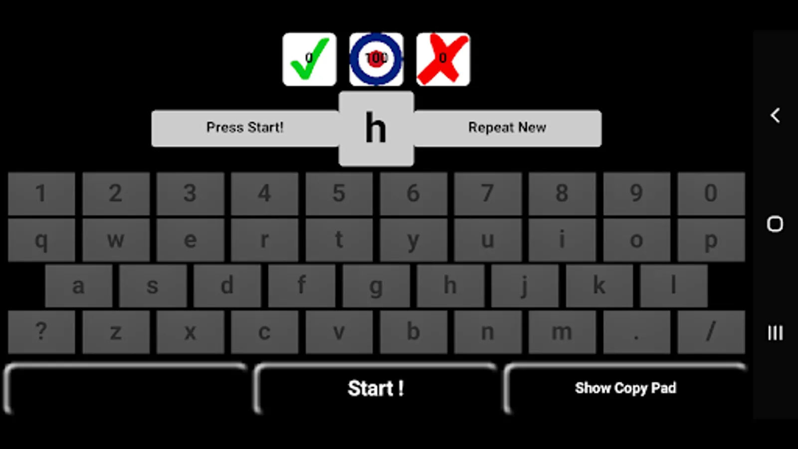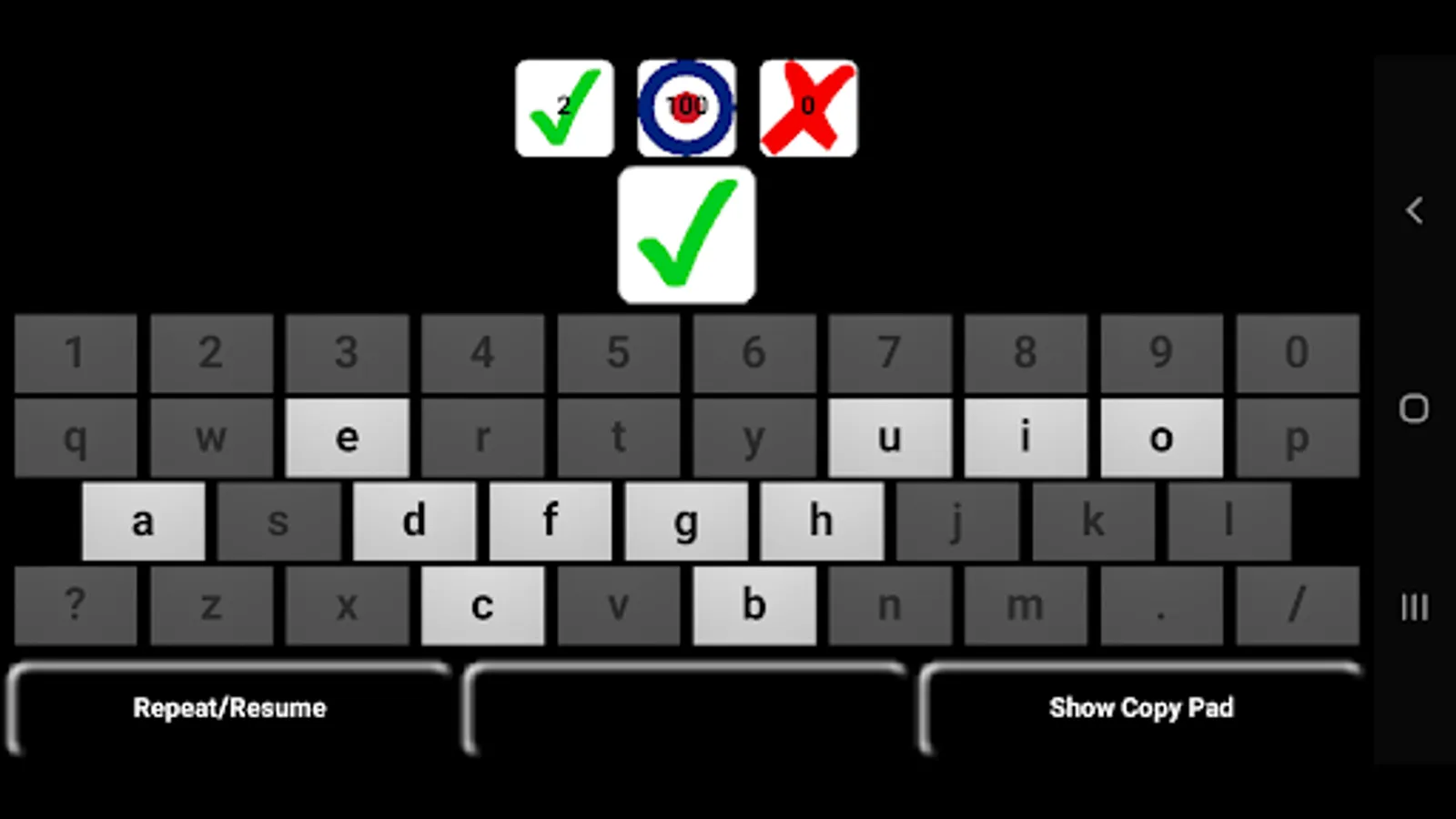 After the string is presented, the app pauses briefly so that you may self-check your accuracy since the Copy Pad does not attempt to recognize your handwriting. If using an external keyboard, then the app will compare what you have entered to the given string. Correct characters are shown in black and characters missed are shown in red.