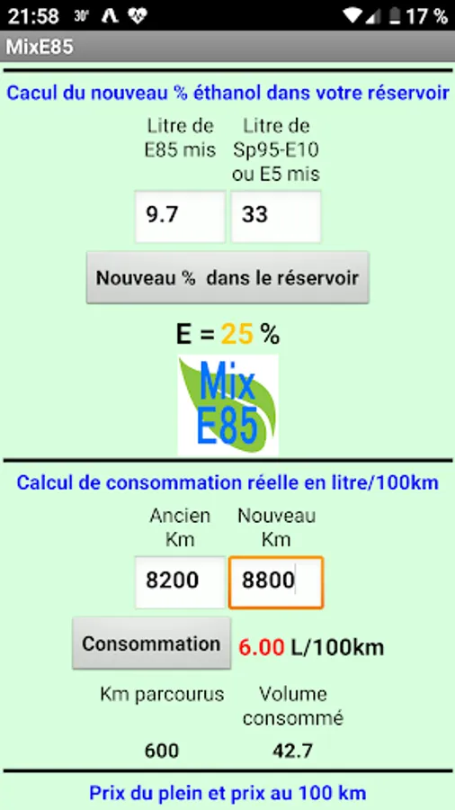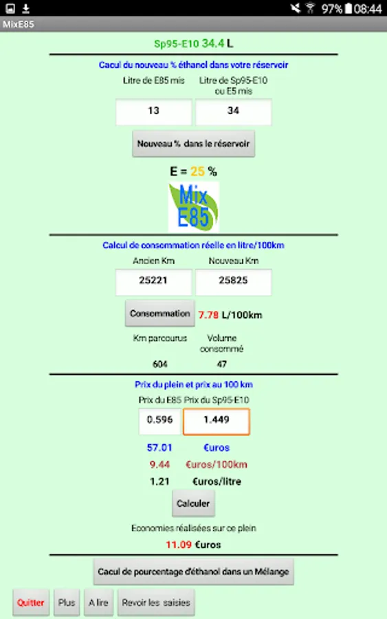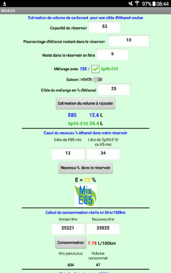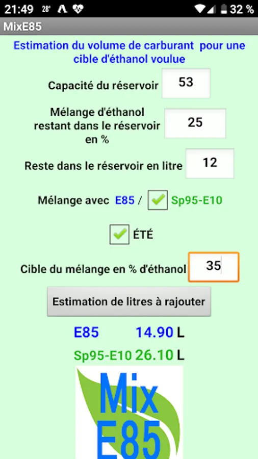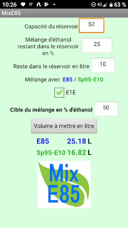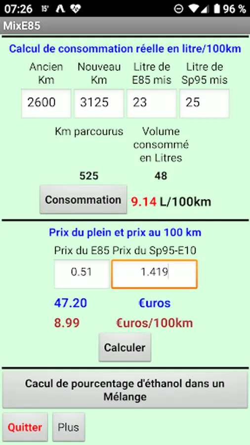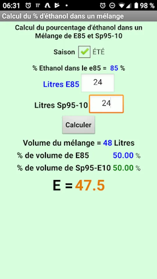 Allows you to quickly calculate the mixture of Superethanol E85 and SP 95-E10 or ET to obtain a desired percentage of ethanol.