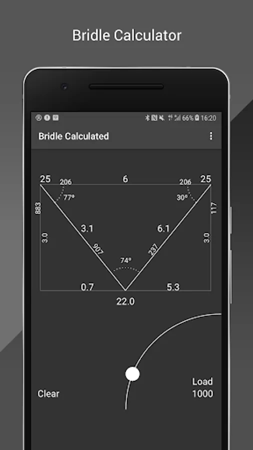 With iBridle you can input values such as: Height of beam, distance between beams, point distance from beam and apex height. iBridle will return the required leg length. iBridle will also give you all relevant angles and loads though-out the bridle and the structure.There is also a scaled view of the bridle.