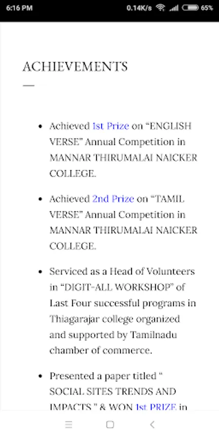 He completed my schooling ( kg to 5th ) in ELLORA MONTESSORI SCHOOL , (6th to 12th) in PNUAPT.DURAIRAJ.HR.SEC.SCHOOL. He completed undergraduate B.Sc.,(Computer Science) in MANNAR THIRUMALAI NAICKER COLLEGE and postgraduate M.Sc.,(Computer Science) in THIAGARAJAR COLLEGE.