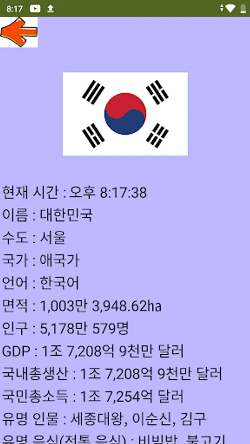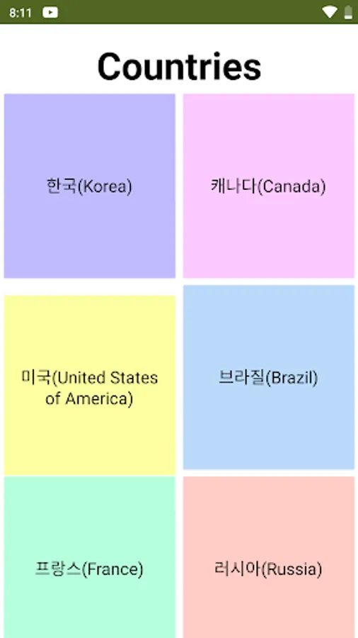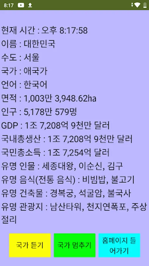 This app explains each country. First, when you enter the main screen, there are 8 country buttons. Korea, Canada, the United States, Brazil, France, Russia, China and Australia (Australia) are introduced. Clicking those buttons takes you to the detailed description screen for each country. First, Korea has the current time, and other countries have the time difference from Korea. Then, in turn, the name of the country, the capital of the country, the country's country, the language of the country, the area of the country, the country's population, the country's GDP, the country's gross domestic product, the country's gross national income, the country's celebrities, the country's Famous food, Nara's famous architecture, and Nara's famous tourist sites are introduced. Celebrities, famous food, famous architecture, and famous tourist sites introduced more than two, so please use them. Below, there are three buttons: ‘Listen to the country’, ‘Stop the country’, and ‘Enter the homepage’. The country listening button literally lets you listen to the country. If you're listening and your country is too long or you want to stop, just click the Stop Country button. If you click the button to enter the homepage, you can enter the government homepage of the country. Click the top arrow button to go back to the main screen. And there is also the flag of the country under the arrow button. And the screen can be scrolled up and down. We have organized a wealth of contents in each country, so you can use it when you need to prepare or travel. I hope my app helps.
