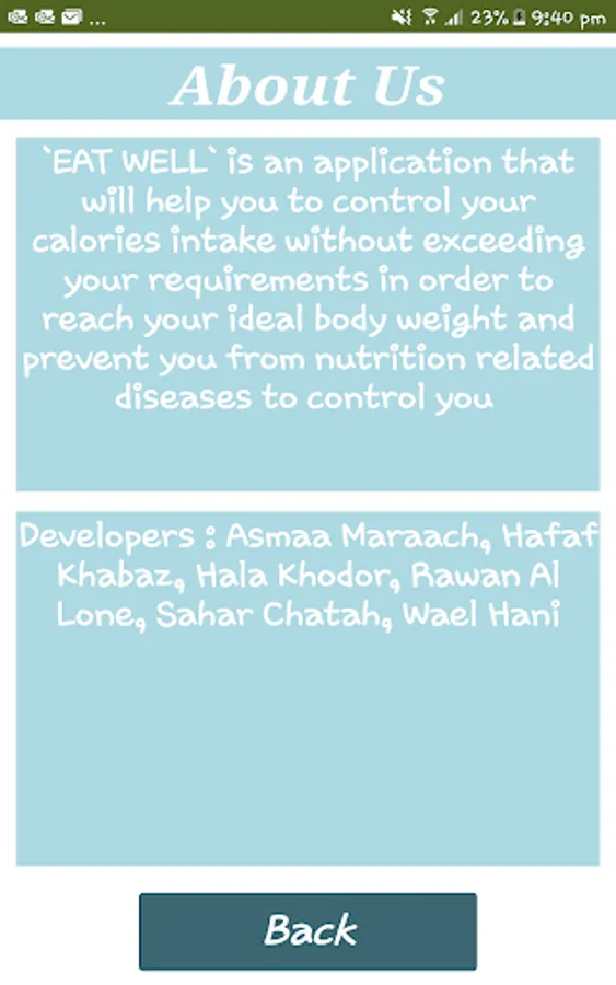 It help in calculation the BMI, the BMR.. it also provides users with healthy recipes (with ingredients), and calories counter. User can also be connected with dietitians, who are members of the group.