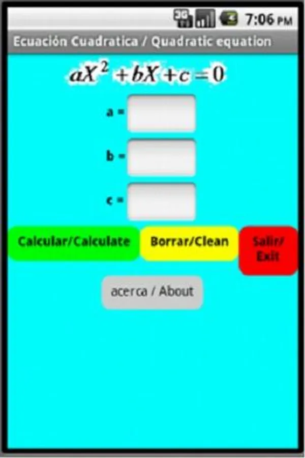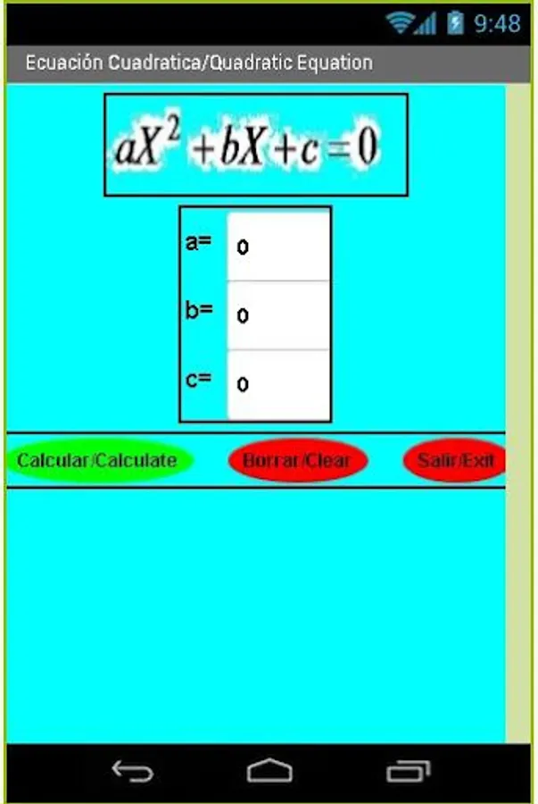 Application that allows solving the quadratic equation. Whithout ads. No need to access your private data.