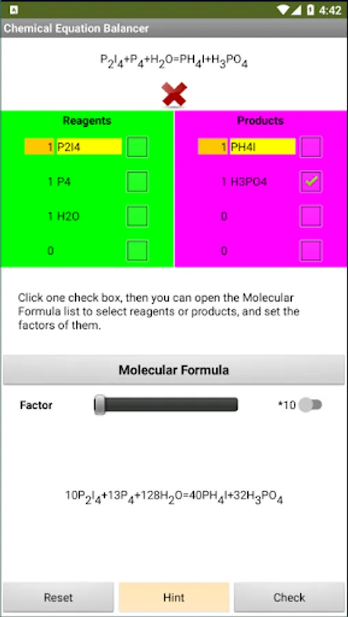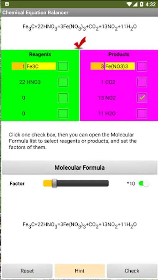 In this app, the chemical equation will be displayed at the top of the screen, you can click the checkbox to open a Molecular formula list and select the reagents and products. There are 4 reagents and 4 products at most. You can move the thumb of slider to change the factors of each molecular formula in the equation. When you have written a complete equation, you can click Check button to check your answer. If your answer is right, a right mark will be shown, and if your answer is wrong, a cross sign will be shown. At this moment, you can press down the hint button to look at the right answer. You can click the reset button to write a new chemical equation.