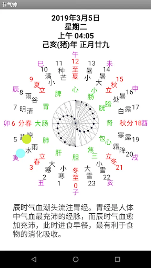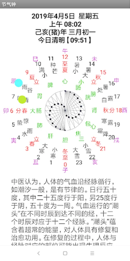 Display the 24 hours of the day and 24 solar terms of the year in a 360-degree circle. Click on the solar terms to view the relevant content.