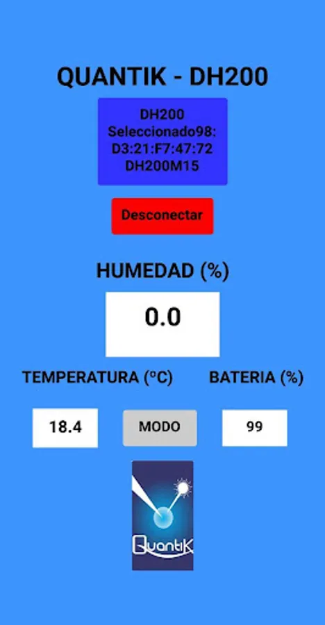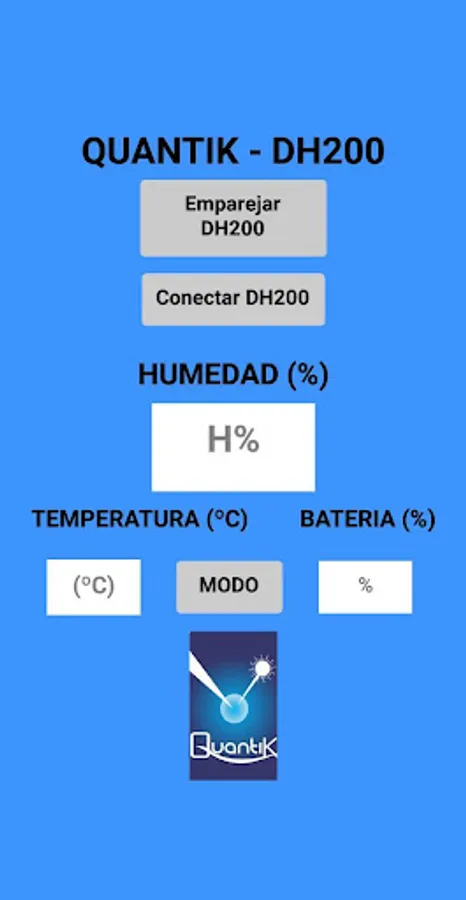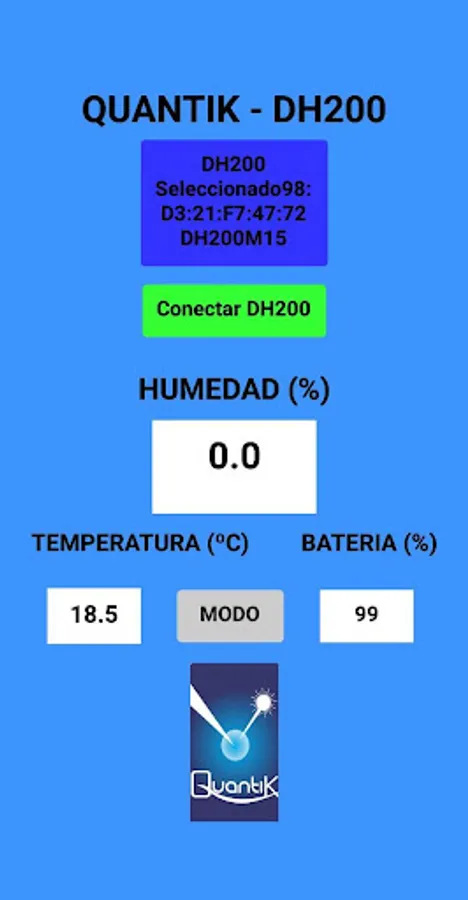 Complementary application to humidity detector DH200 of Industrias Quantik SAS. It allows to display jointly the percentage of humidity of the sample inside the cell, the temperature of the sample and the battery percentage of the device. Connection by classic Bluetooth and soon by BLE.