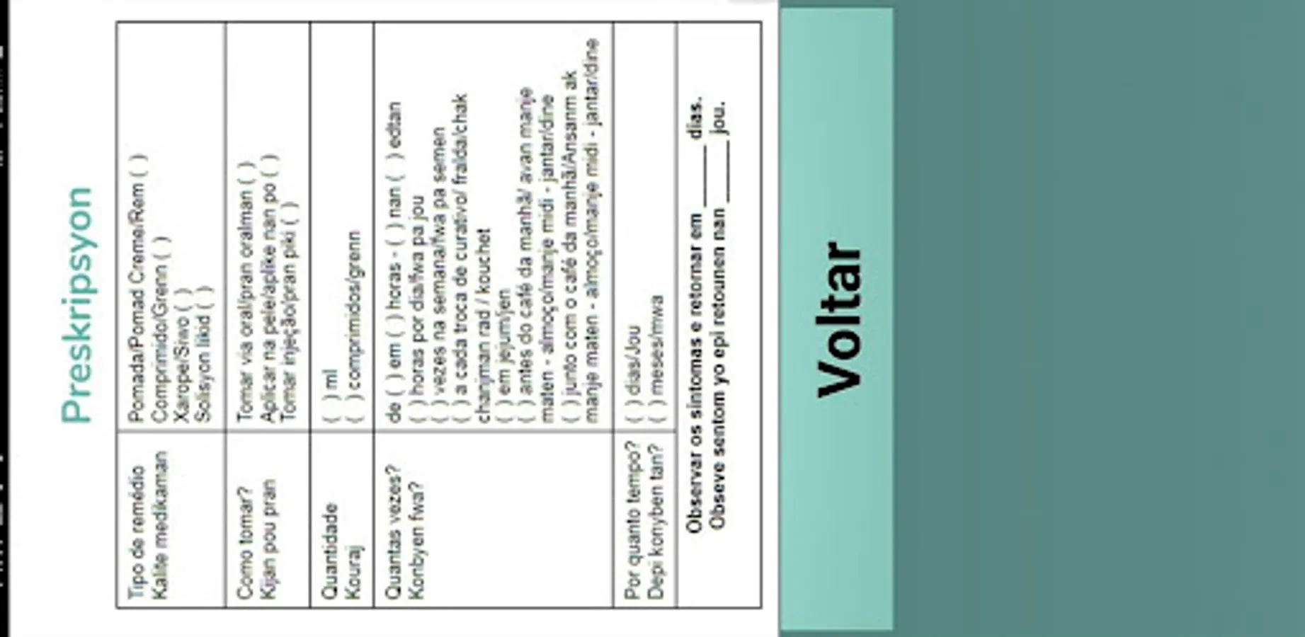 This APP aims to update, expand and make available the bilingual material (Portuguese and Creole), which was produced and distributed to the municipal health and social assistance network of the municipality of São José through the extension project completed in 2020, to be used in family health programs, emergencies, SAMU and reception of immigrants through social assistance. This first version of the material is available online on the IFSC campus SJ wiki, http://bit.ly/2Wih6Nj
