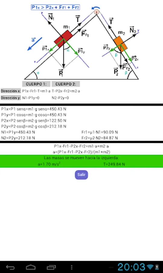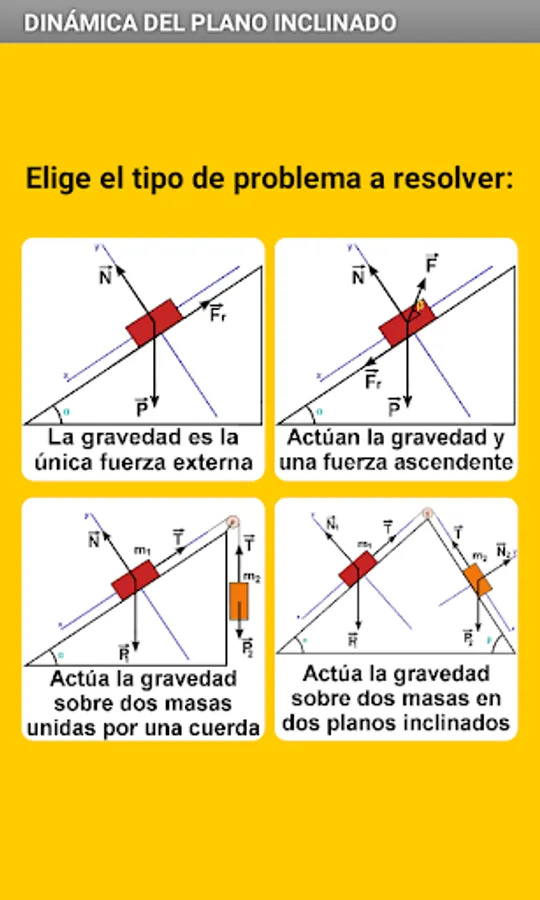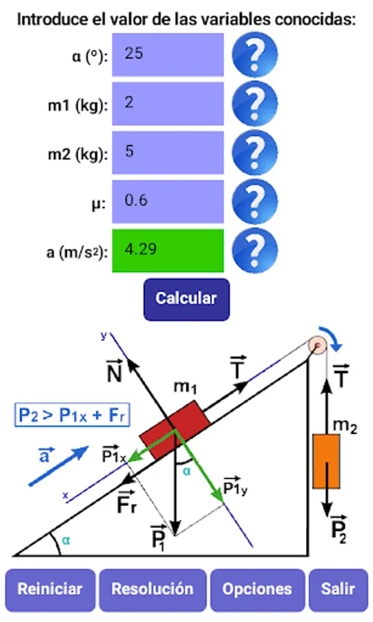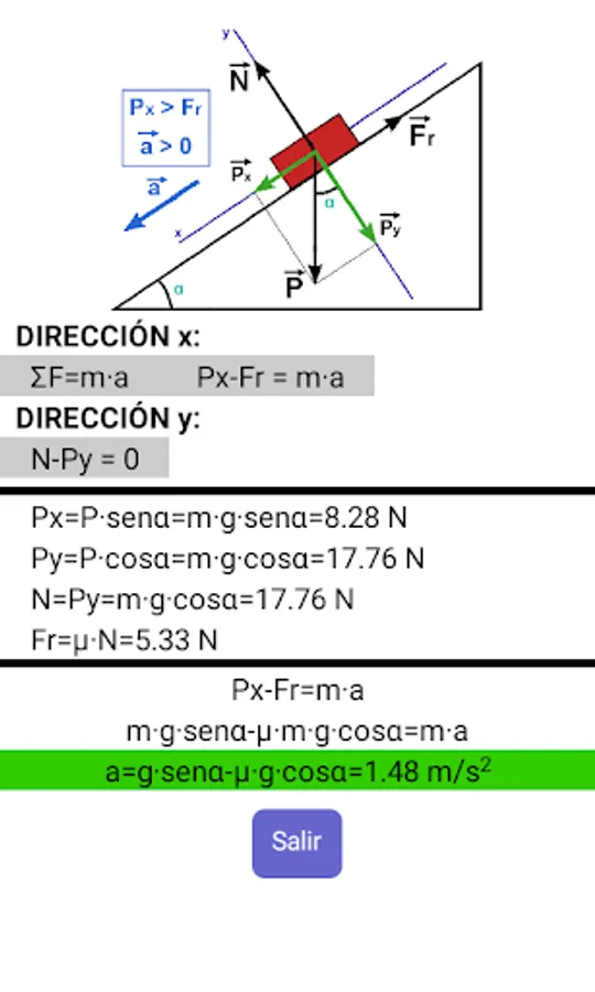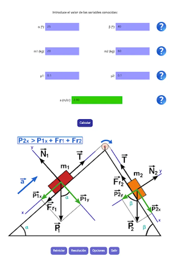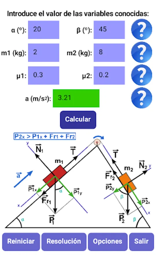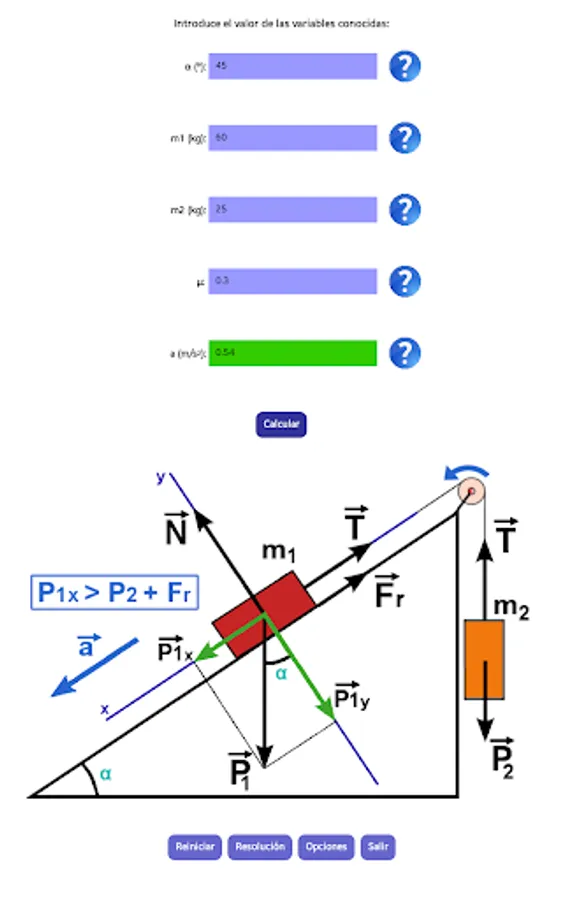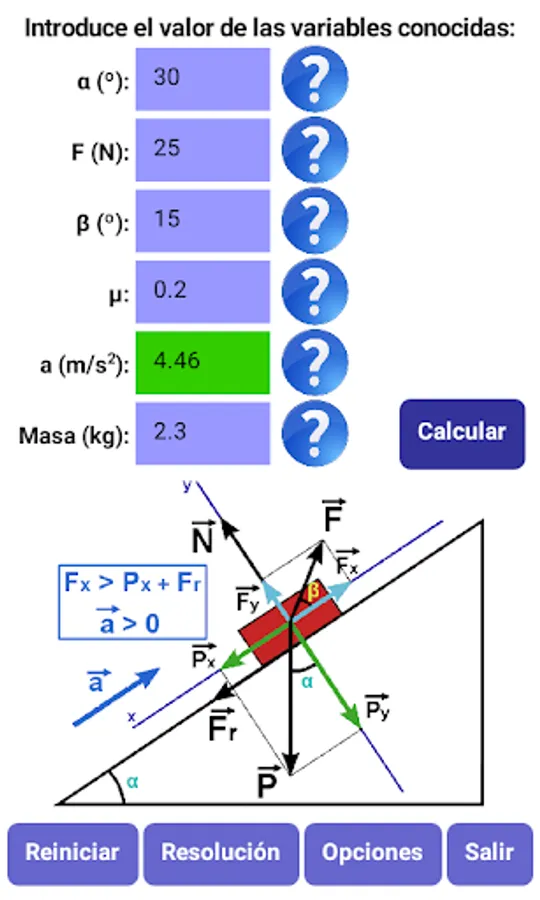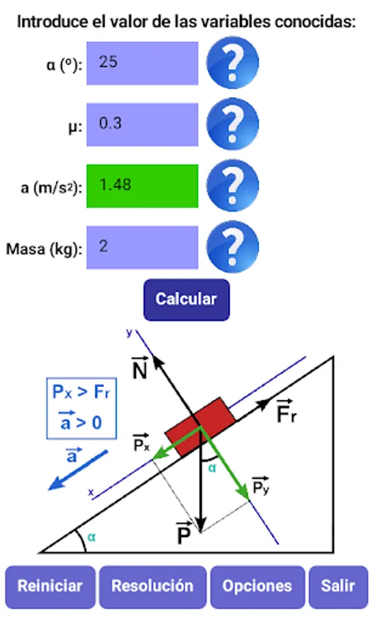 Calculated numerically and vectorially represents the main variables involved in the problems of dynamics inclined plane.