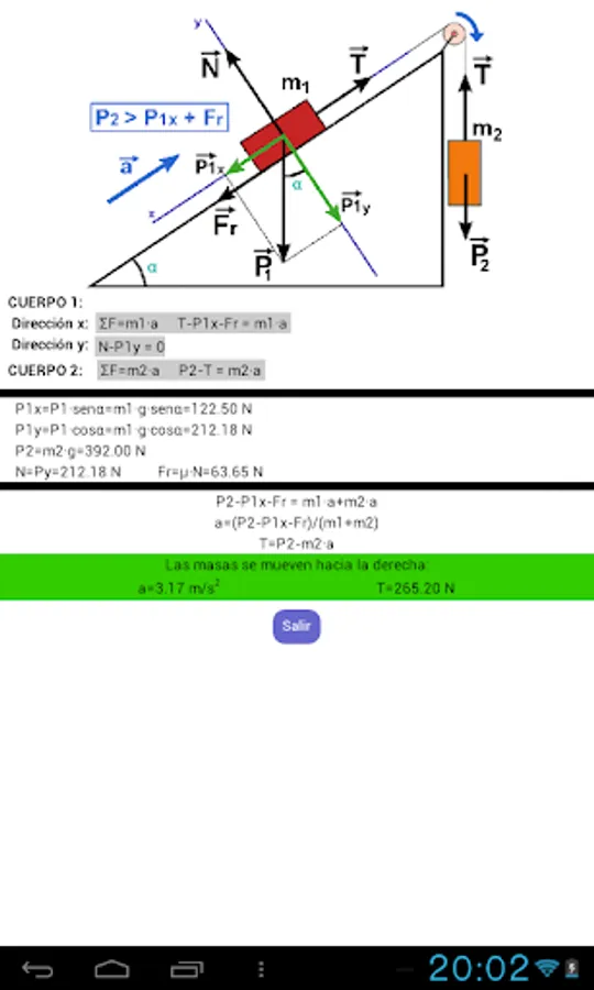 In all cases the acceleration can be calculated with the mass (or mass) is moved and, depending on the type of problem, other variables can be calculated as the coefficient of friction, the upward force or tension rope.