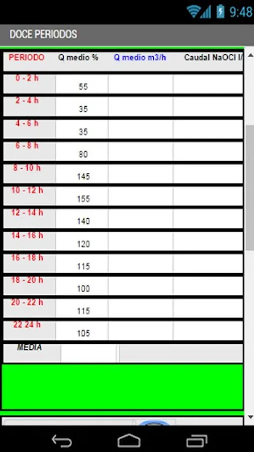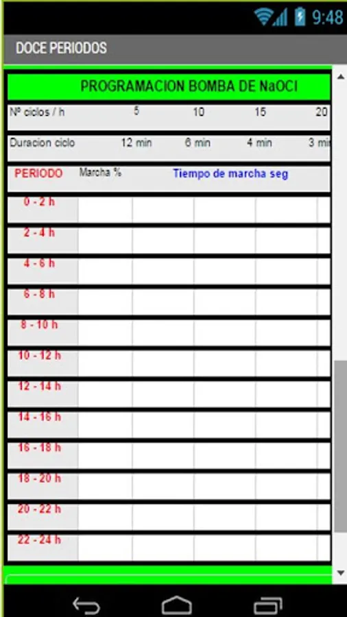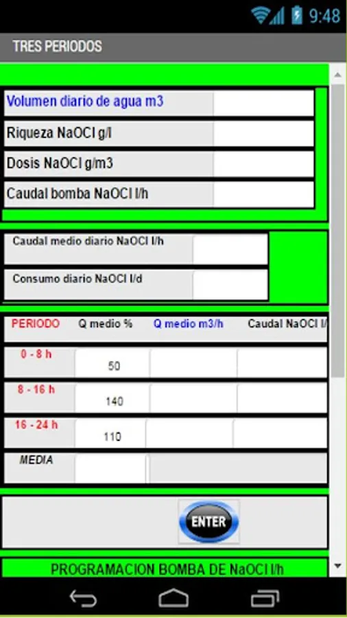 The application makes the calculations for a dosage of hypochlorite proportional to the flow rate of water to be measured as measured by a pulse counter. In case of not having a counter with pulse output, the dosage can be adjusted by means of four flow emulations in one, three, six and twelve daily periods. Also in each of them it is possible to select between 5, 10, 15 and 20 cycles per hour. These options allow a good adjustment. It also calculates the running and stopping times of the hypochlorite dosing pump. These values can be entered in a time scheduler or automatism.