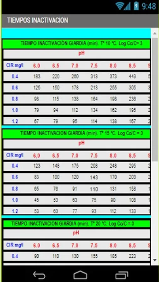 It also presents tables with inactivation times of giarda and viruses for various concentrations of free residual chlorine at various temperatures and pH according to the EPA.