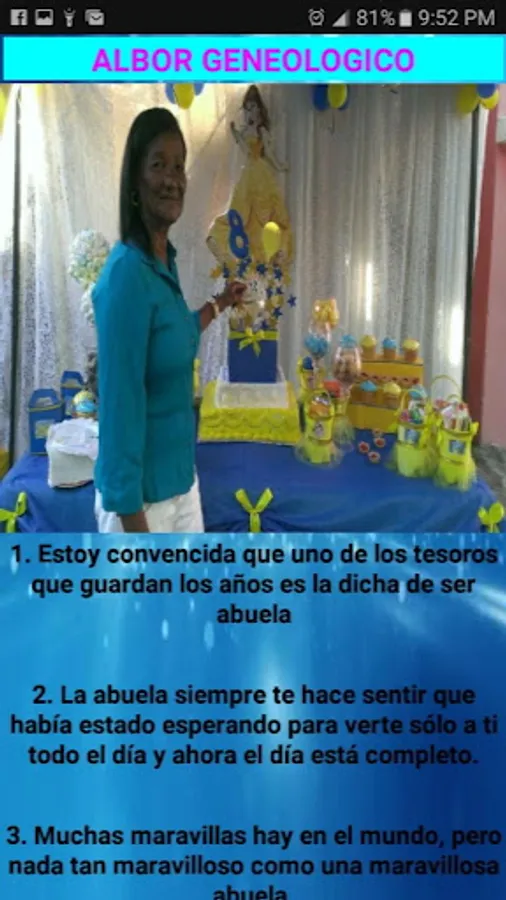 This is an application aimed at the geneology of a family starting with the grandmother, then the children, grandchildren and the family demos of this person, this is for the knowledge of all relatives.