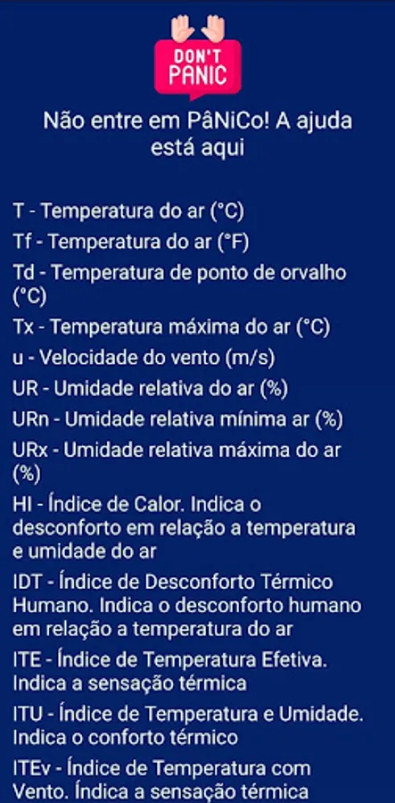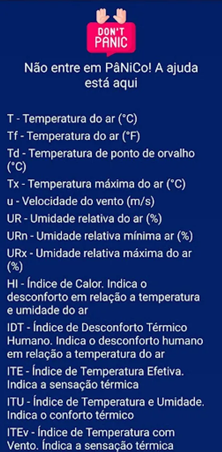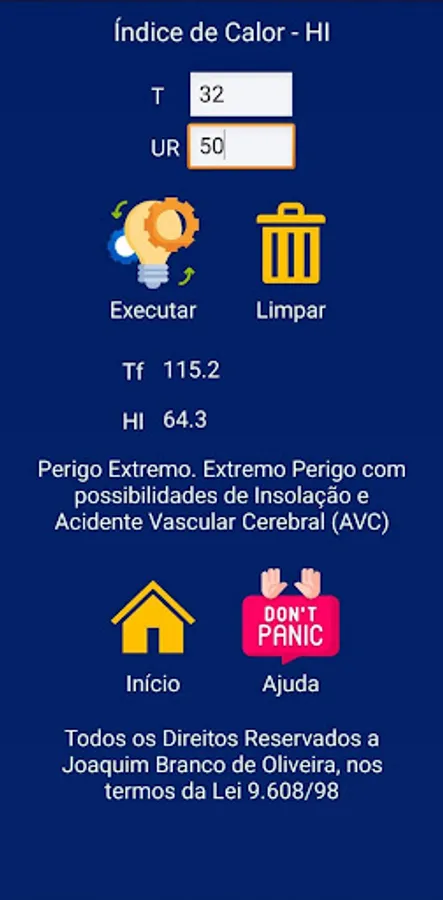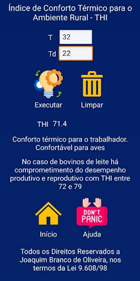 With the application it is possible to determine the heat index (HI), thermal discomfort index (IDT), effective temperature index (ITE), temperature and humidity index (ITU), effective temperature index with wind (ITEv), index perceived equivalent temperature (ITEP) and the thermal comfort index for the rural environment (THI). With obtaining each index, the interpretation of the calculated value is also informed