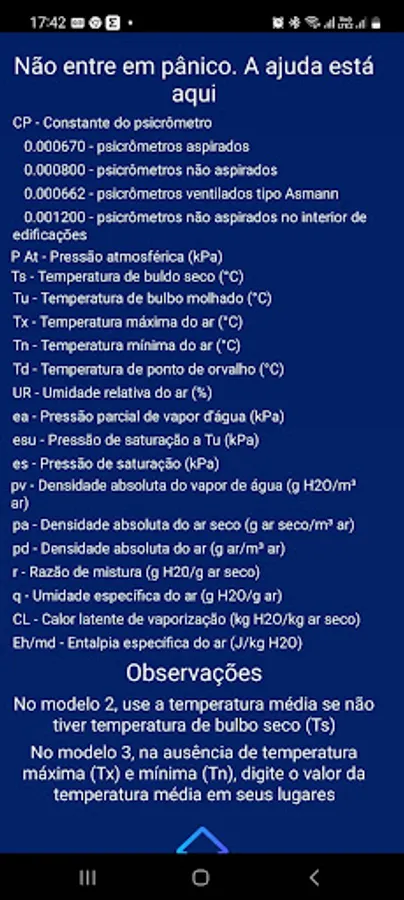 From the elements of climate air humidity, air temperature, maximum and minimum air temperature and dew point temperature, depending on the chosen model, the application quantifies the water in the air by determining: relative humidity, dew point temperature, mixing ratio, specific humidity, enthalpy, absolute water vapor density, absolute dry air density, and absolute air density