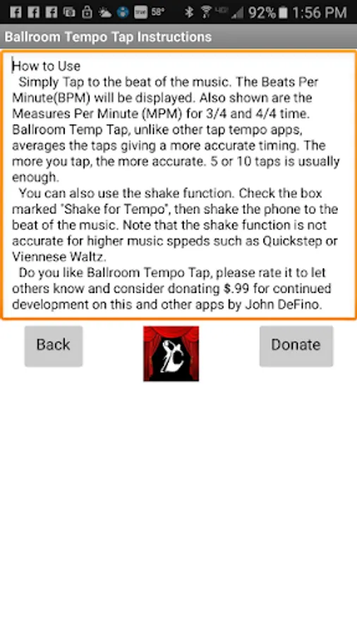 Ballroom Temp Tap, unlike other tap tempo apps, averages the taps giving a more accurate timing. The more you tap, the more accurate. 5 or 10 taps is usually enough.n