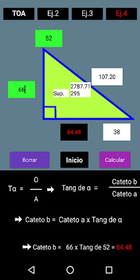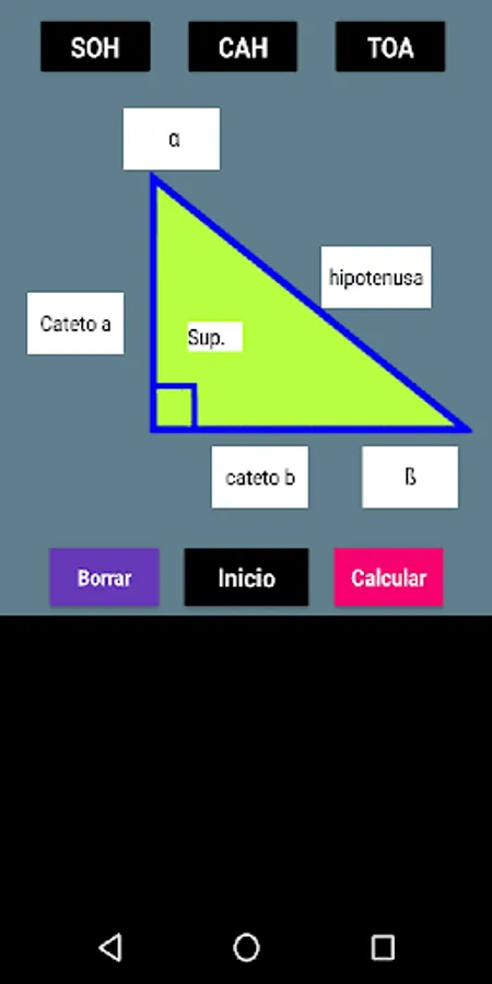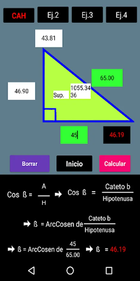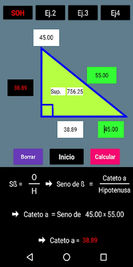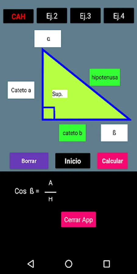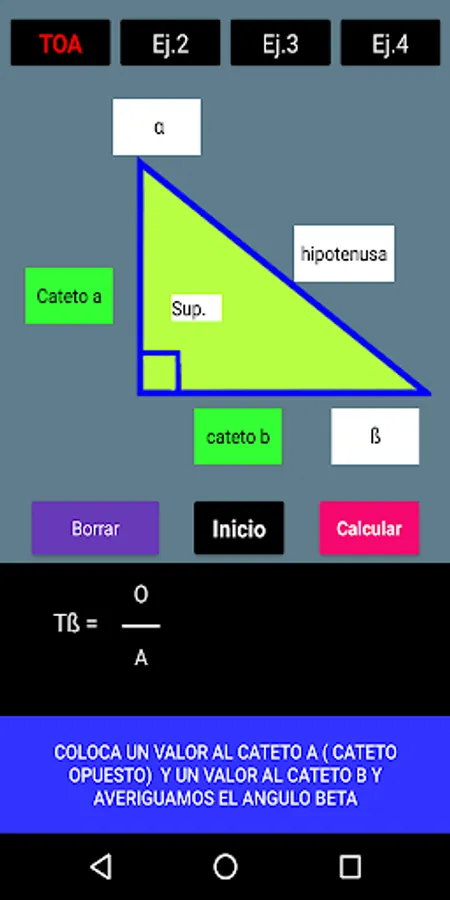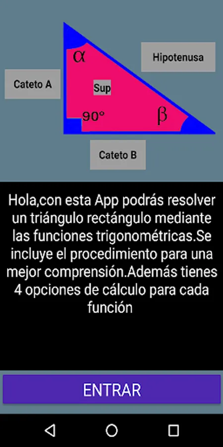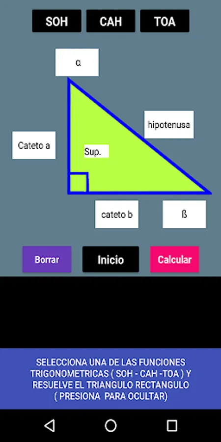 With this App you can solve a right triangle using trigonometric functions. The procedure is included for a better understanding. You also have 4 calculation options for each function. The Mnemonic Rule SOH-CAH-TOA refers to the 3 trigonometric functions. SOH: Sine of Angle = Opposite Leg / Hypotenuse, CAH: Cosine of Angle = Adjacent Leg on Hypotenuse and TOA = Tangent of Angle = Opposite Leg on Adjacent Leg