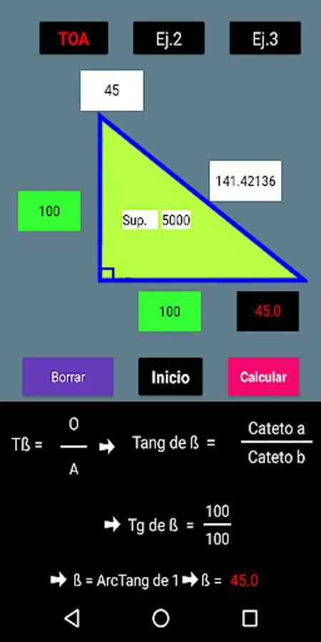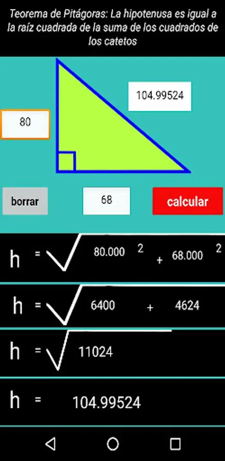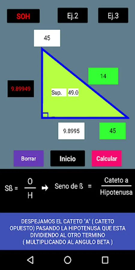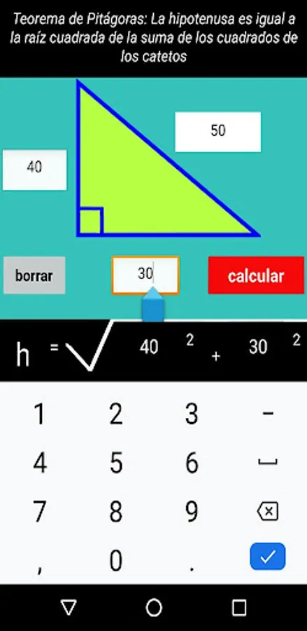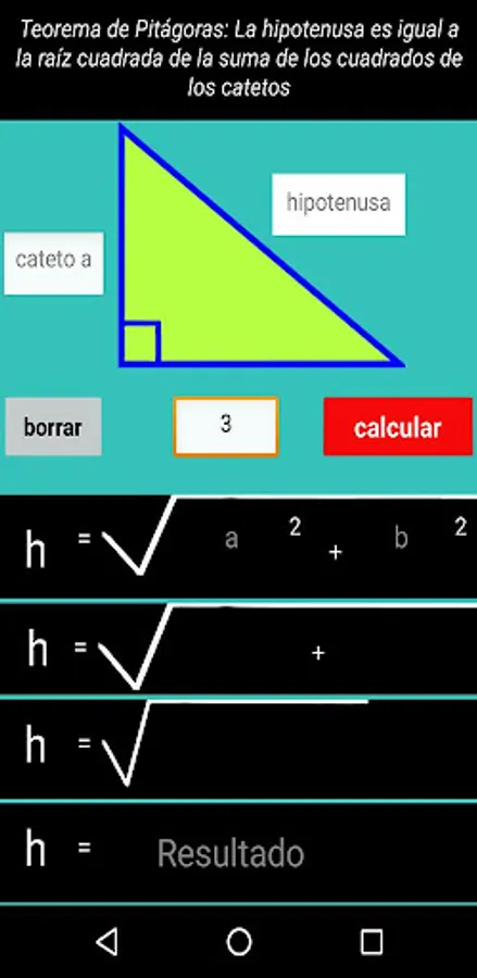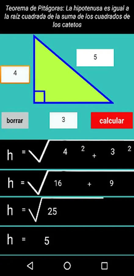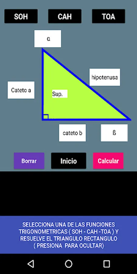With this app it is possible to find out the value of the hypotenuse, the legs A or B, the angles and the surface of the right triangle by completing 2 variables, shows the procedure, either by means of the Pythagorean theorem or by means of the trigonometric functions (SOH-CAH-TOA)
