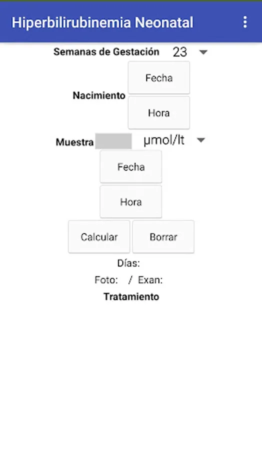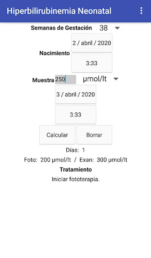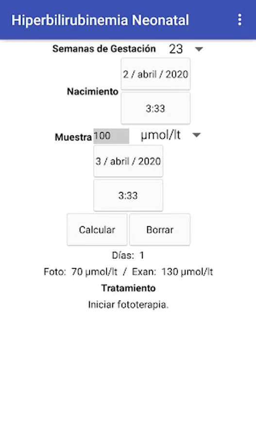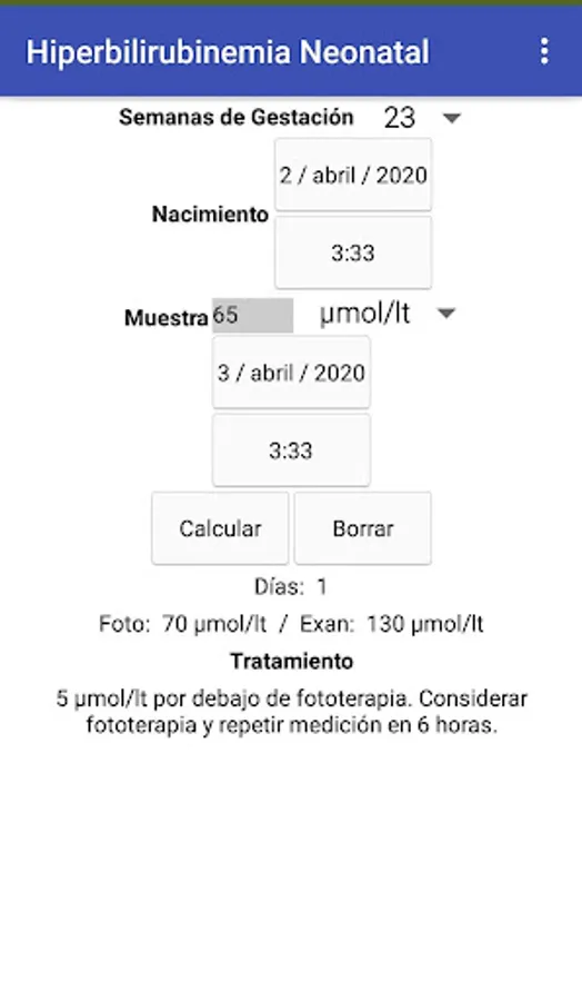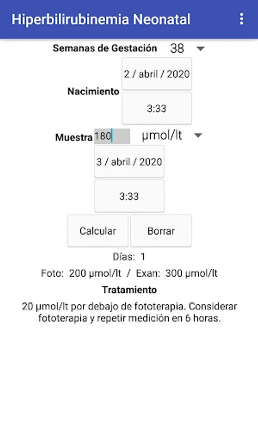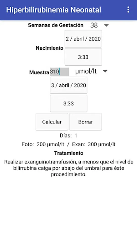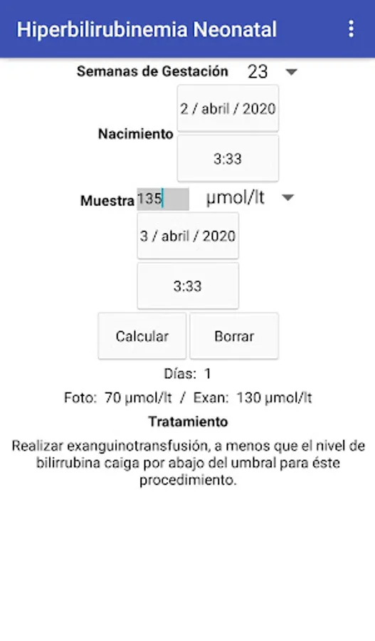 The application calculates the ranges for exsanguine or phototherapy treatments for neonatals from 23 weeks of gestation onwards from the date and time of birth and the date and time of the sample