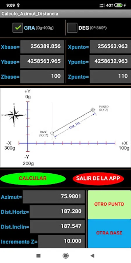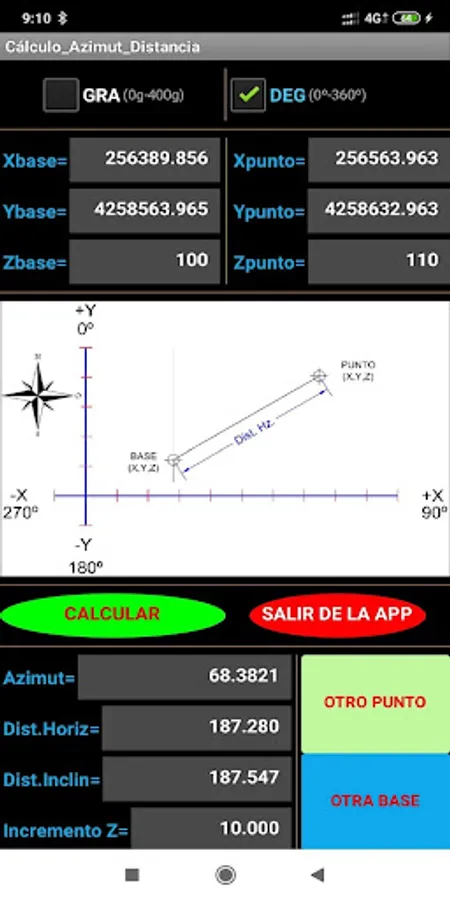 The objective of this application is to calculate the AZIMUT, DISTANCE and INCREASE OF COTA between a base and a point.