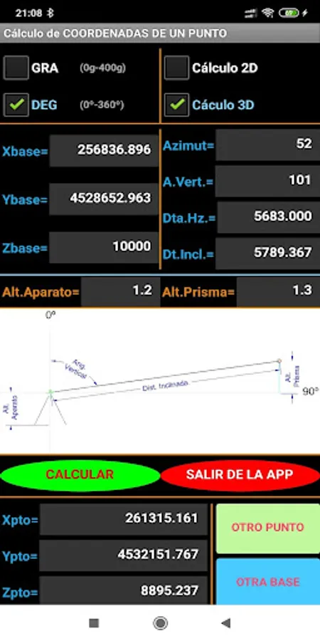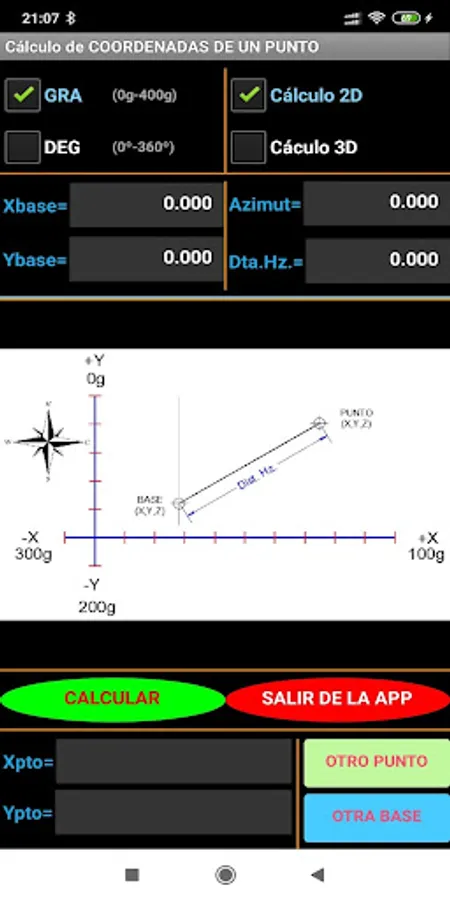 The most important function of this application is to calculate the coordinates of a point from a base, the calculation can be done in decimal degrees or in centesimal degrees and can be calculated in two or three dimensions, simply by checking a checkbox.