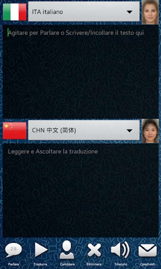 With a little smarthphone shake lets you speak recognizing your voice. If you prefer you can type or paste any text. Automatically output language translation will be heard, also shown on the screen.