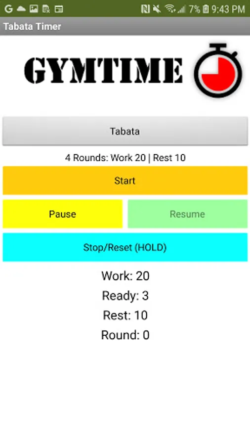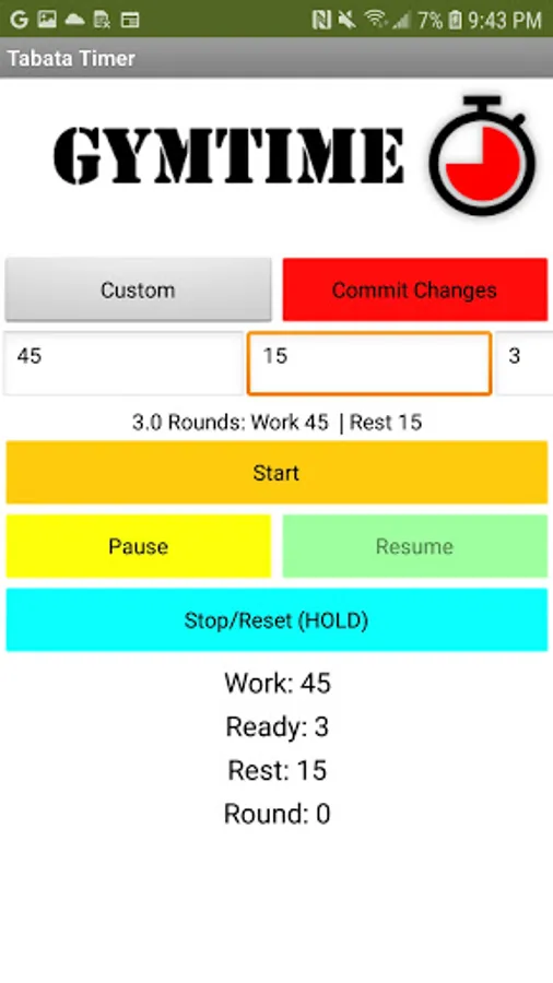 A Tabata Style Countdown Timer with default Tabata or Custom timings. Includes audible tones and vibrations. Includes 3-2-1 countdown to work rounds and timer for rest rounds. Audio text to speech counts down the final three seconds of the final round. In custom mode, set work seconds, rest seconds, and number of rounds.