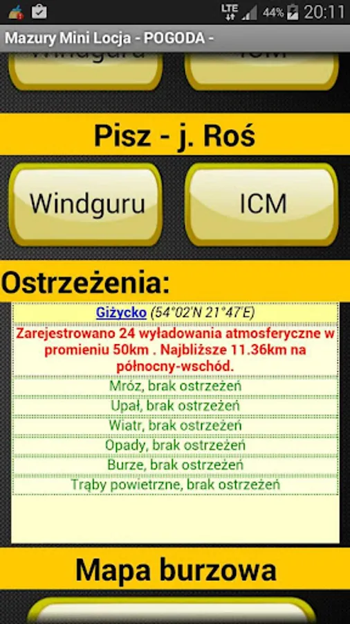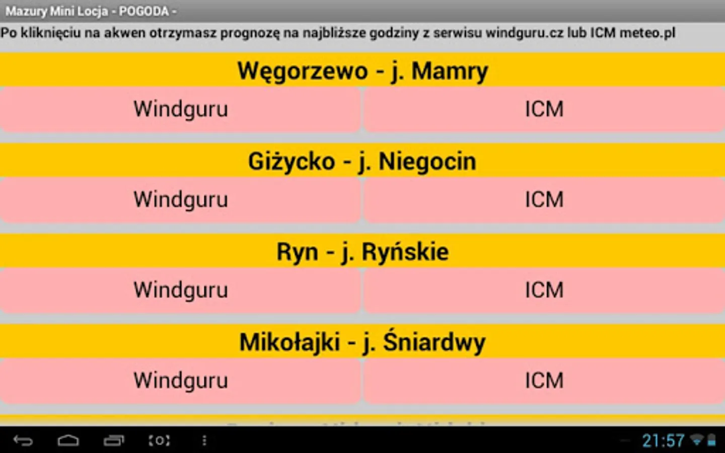 - WEATHER - weather forecast in Hawaii for a sailor for selected bodies of water such as: Węgorzewo - j. Mamry Giżycko - j. Niegocin, Mikolajki - j. Śniardwy, Ruciane Nida - j. Nidzkie, Pisz - j. Ros, Ryn - j. Ryńskie. It is based on light maps windguru.cz and meteorogramach ICM meteo.pl