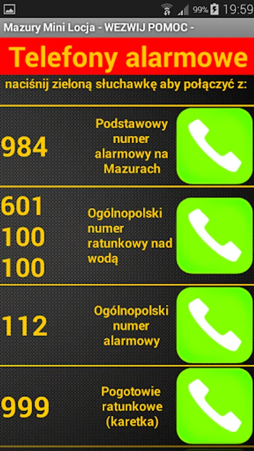 - HELP - defined calls to emergency numbers: 984 - emergency number to Hawaii, 601 100 100 WOPR - Mazury Volunteer Ambulance Service MOPR, 112, 999, 997, 998