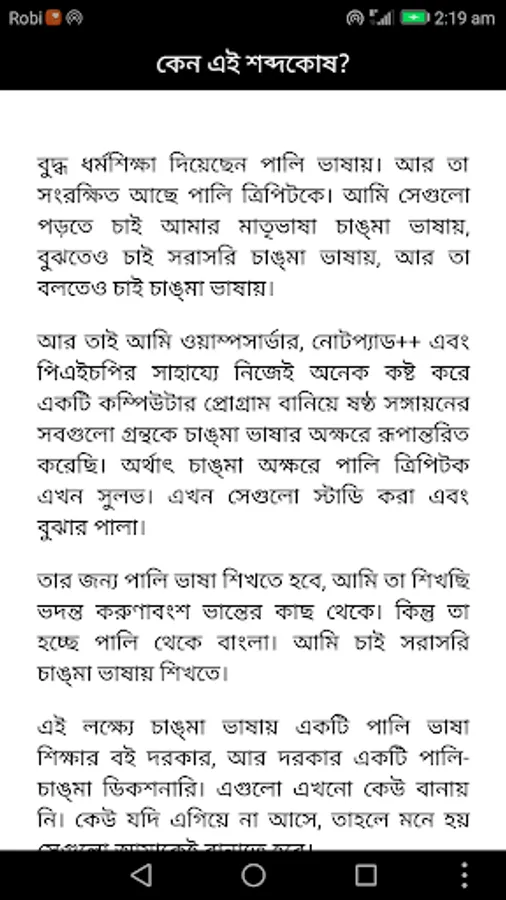বুদ্ধ ধর্মশিক্ষা দিয়েছেন পালি ভাষায়। আর তা সংরক্ষিত আছে পালি ত্রিপিটকে। আমি সেগুলো পড়তে চাই আমার মাতৃভাষা চাঙ্মা ভাষায়, বুঝতেও চাই সরাসরি চাঙ্মা ভাষায়, আর তা বলতেও চাই চাঙ্মা ভাষায়।