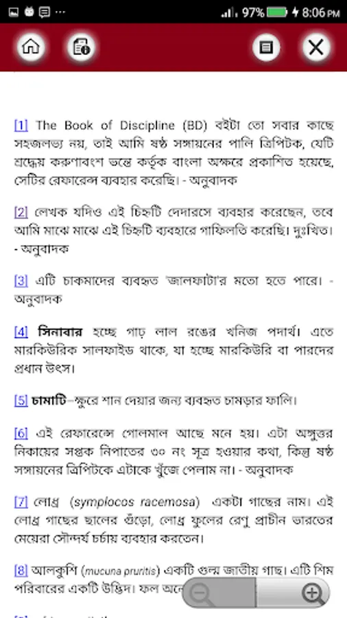 মূল বইয়ে ঠানিস্সারো ভান্তের ইংরেজি বাক্যগুলো খুব লম্বা লম্বা। সেখানে আছে কমা, সেমিকোলন, কয়েক ধরনের ড্যাশ, (সেই ড্যাশগুলোর কি বাহার!) আরও নানা ধরনের চিহ্ন দিয়ে যুক্ত করা কথাবার্তা। এমনও আছে, একটা বাক্যতেই একটা বড়সড় প্যারাগ্রাফ হয়ে গেছে। এমনও হয়েছে, পড়তে পড়তে কথার মাঝখানে পৌঁছে ভুলে গেছি প্রথমে কী বলেছে। সেগুলোর জট ছাড়িয়ে সোজা বাংলায় লেখাটা আমার কাছে বড়ই দুষ্কর কাজ মনে হয়েছে, মাঝে মাঝে মাথার চুল ছিঁড়তে ইচ্ছে হয়েছে। (ভাগ্য ভালো, আমি ন্যাড়া মাথার ভিক্ষু, নাহলে কী যে হতো ভেবে পাই না!) তবে আমি প্রথমে বুঝতে চেষ্টা করেছি বাক্যটা কী বলতে চাচ্ছে। এরপর ভেবেছি সেটাকে ভেঙে বর্তমানে প্রচলিত সহজ বাংলায় বললে কীভাবে বলা হতো। এরপর ভেবেছি, সহজ ভাষায় লিখতে গিয়ে অর্থের বিকৃতি ঘটছে কিনা, সেটাতে ভুল বুঝার অবকাশ রয়েছে কিনা, (কারো পাকা ধানে মই দিচ্ছি কিনা)। চেষ্টা করেছি সহজ ভাষায় লেখার জন্য। মাসের পর মাস লিখে গেছি। সবসময় মাথার প্রসেসর ভালোমতো লজিক মেনে কাজ করেছে এমন নিশ্চয়তা আমি দিতে পারি না। তাই ভুলভ্রান্তি হওয়াটাই স্বাভাবিক। আশা করছি কোনো ভুলভ্রান্তি ধরা পড়লে নালাগিরি হাতির মতো দয়া নেই, ক্ষমা নেই এমন হবেন না। এই বেচারা অনুবাদকের প্রতি করুণাপরবশ হয়ে সেগুলো ক্ষমাসুন্দর দৃষ্টিতে দেখবেন (এবং যদি আরেকটু দয়া হয় তো ভুলটা একটু দেখিয়ে দিয়ে যাবেন)।