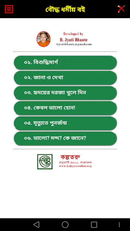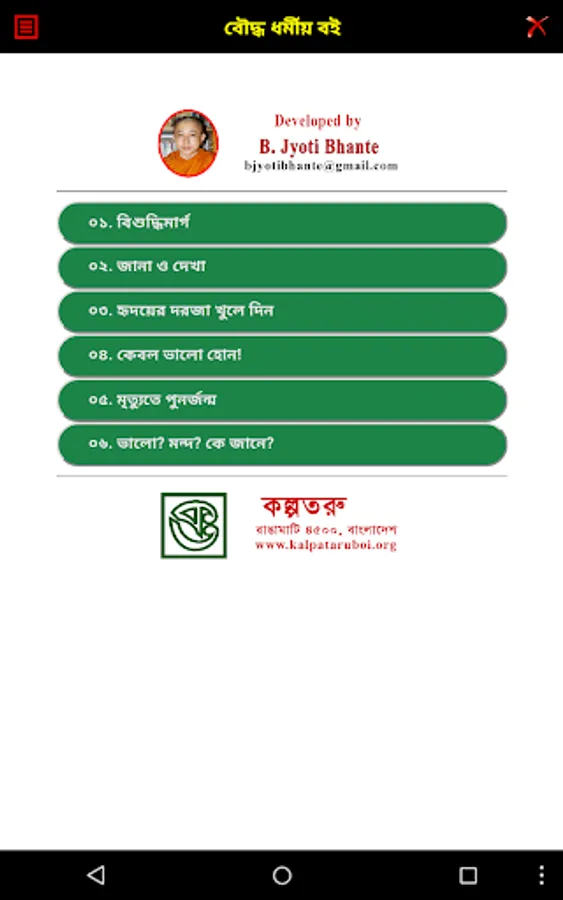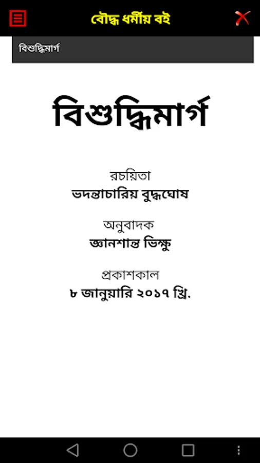 শুরুটা করেছিলাম বৌদ্ধধর্মের গুরুত্বপূর্ণ “বিশুদ্ধিমার্গ” বইটাকে অ্যাপস বানানোর জন্য। পরে মনে হলো এটা বাদেও তো আরো অনেক বুদ্ধধর্ম বিষয়ক বই আছে যেগুলোর অ্যাপস বানানো উচিত। সুতরাং এত্তগুলো অ্যাপস বানানোর ঝামেলা না করে একটা অ্যাপসেই যাতে সব গুরুত্বপূর্ণ বইগুলো রাখা যায় সেভাবেই বানাতে হবে। সে অনুসারেই ৫/৬দিন ধরে কাজ করে একটা অ্যাপসেই ছয়টা গুরুত্বপূর্ণ বই দিয়ে আপাতত অ্যাপসটা বানানো সমাপ্ত করলাম। পরবর্তীতে প্রয়োজন হলে অ্যাপসটাতে আরো বই সংযোজন করা যাবে।