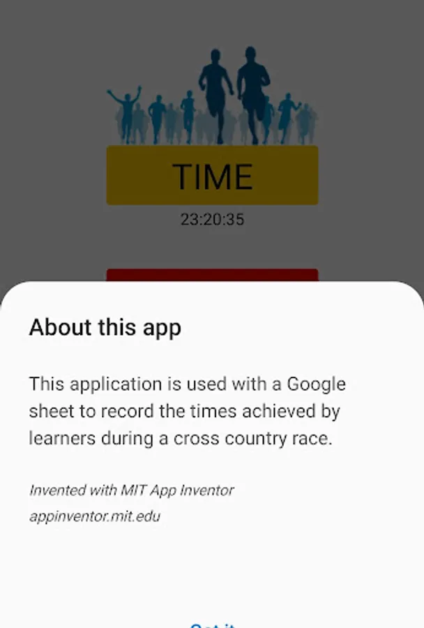This app can be used to record the times of athletes who are competing in a cross country event. It also scans QR codes and saves it in a Google sheet.