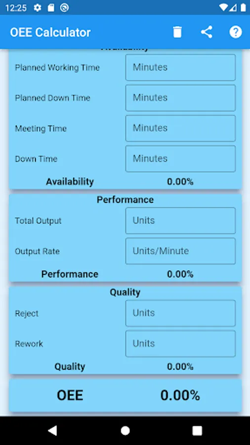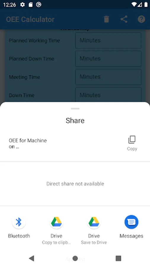 When you enter data, the app calculates the Availability, Performance and Quality when it has data to calculate those. If you enter any non-numeric value, you will receive an error message. After you enter all data, you can share it with others using the share button. You can clear the data using the “Clear” button.