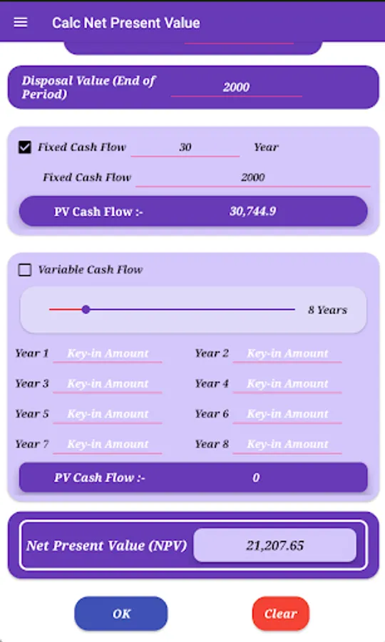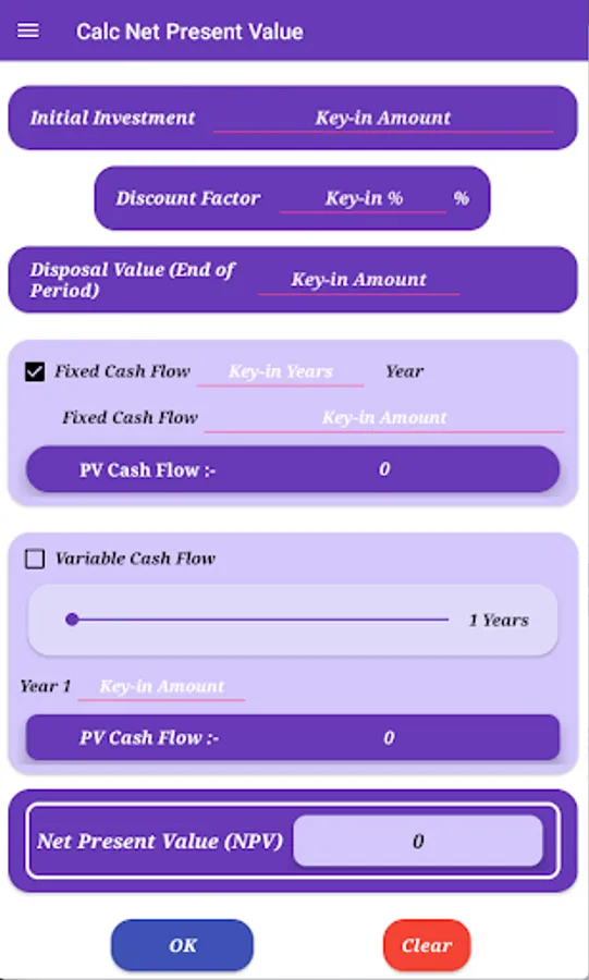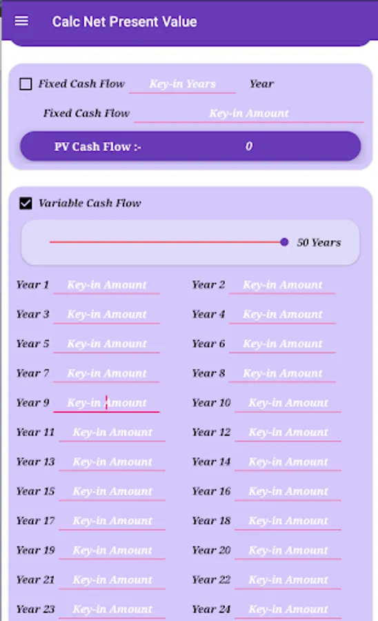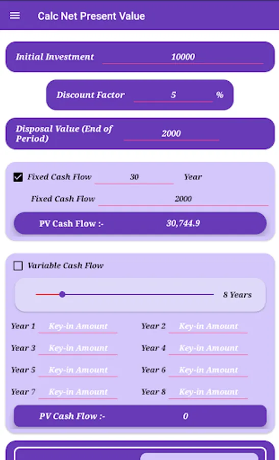 Calculate Net Present Value with option Fixed Cash Flow or Variable Cash Flow.