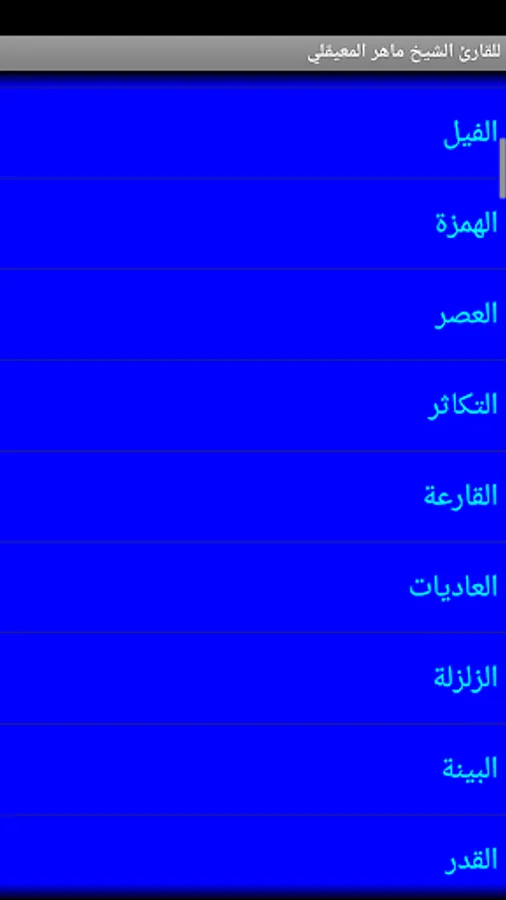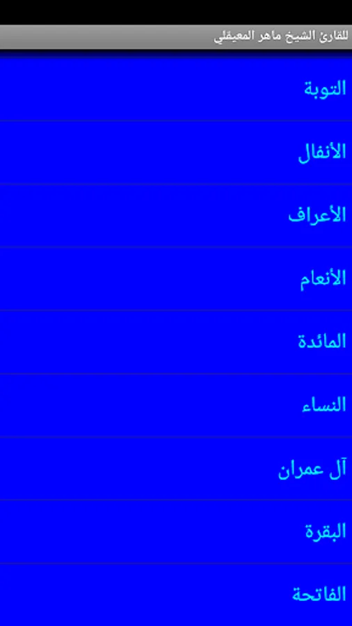 استمع الى 114 سوره مع القارئ الشيخ ماهر المعيقلي يمكنك ان توقف الصوت في آيه معينه ثم تكملت الايه فيما بعد وان تختار اي سوره تريدها بالضغط على سور ثم الضغط على تشغيل وبامكانك رفع الصوت او خفض الصوت واذا خرجت من التطبيق الصوت يستمر معاك حتى عند استخدام تطبيق اخر ويستعمل في مسجل السياره عبر البلتوث والتطبيق مساحته جدا صغيره وخفيف ومميزاته كثيره وغيرها اكتشفها بنفسك والصوت بجوده عاليه جدا وواضحه.