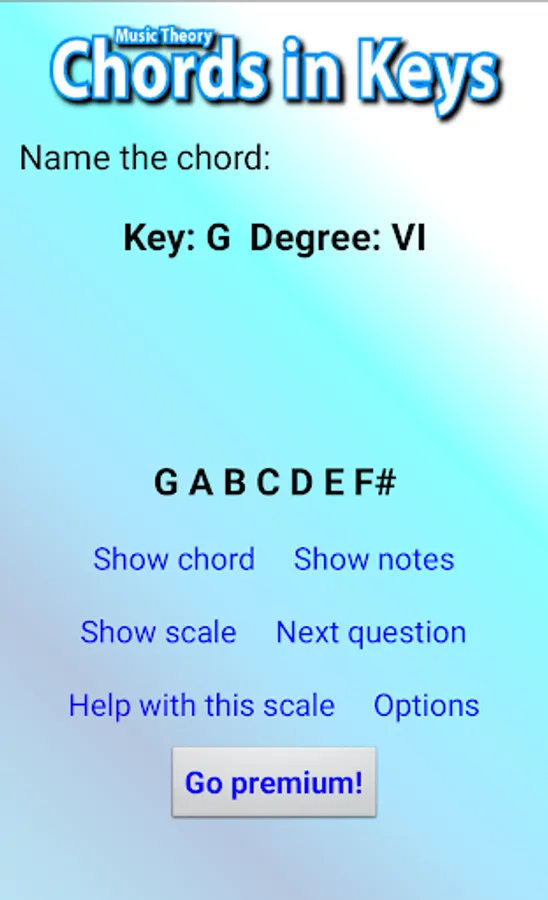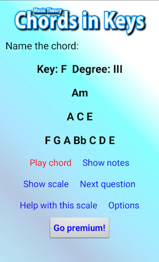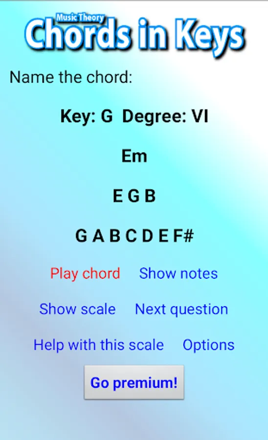 This music theory app will also display the notes within each chord and the notes within each scale, allowing you to test your musical knowledge even further, or assist you in working out the correct answers.