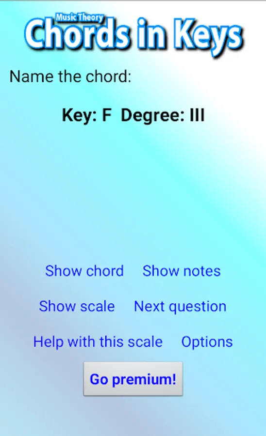In addition you can click 'Play chord' to hear the chord you are being tested on. The tonic chord of the current scale is played, followed by the chord in question, followed by the tonic chord again. This way you not only learn music theory but also develop your aural skills at the same time.