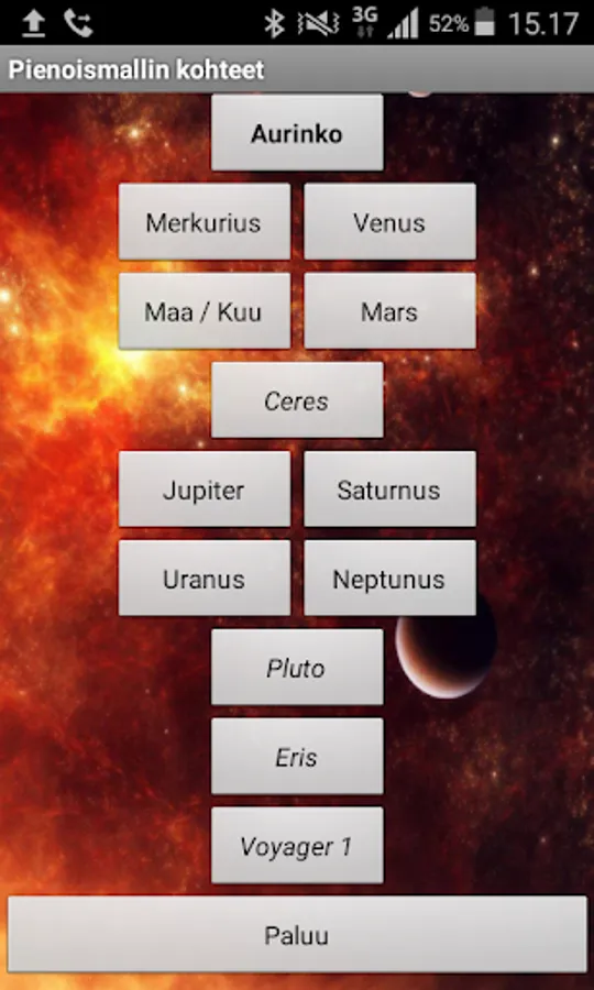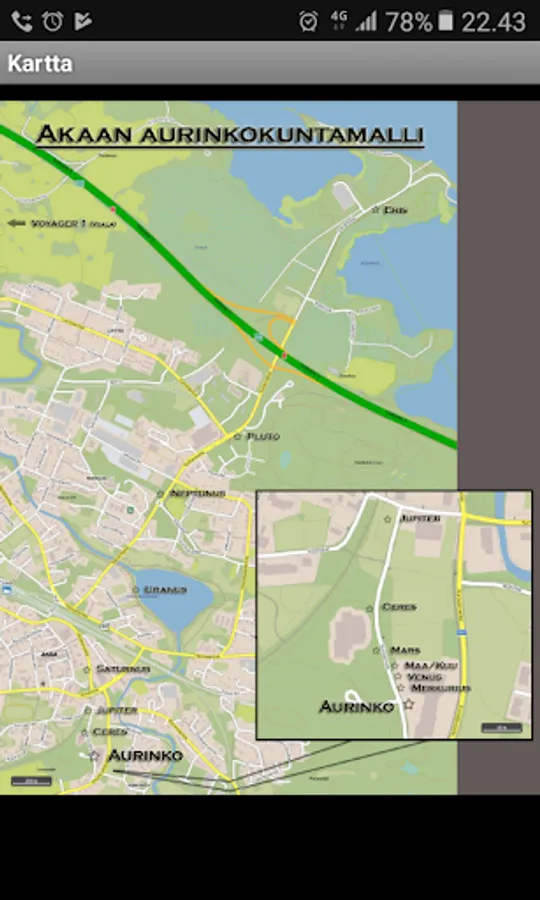 This application has information about Akaa Solar System Scale Model, which was installed in Akaa, Finland in 2017. The scale model has a scale of 1 in 3 000 000 000. Application includes guided walking tour of the scale model, maps, data chart and general information of our Solar System. It has also information about the scale model of Proxima Centauri -star, which was added to the scale model in 2018 and is located in Yulara, Australia.
