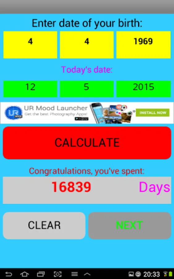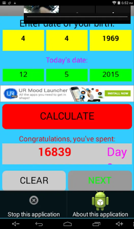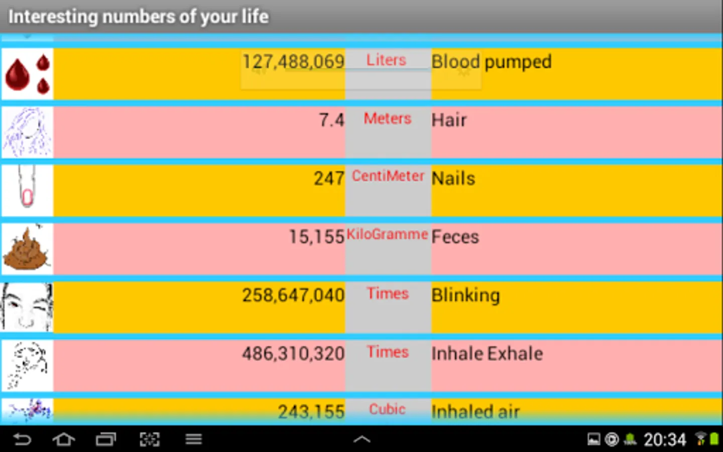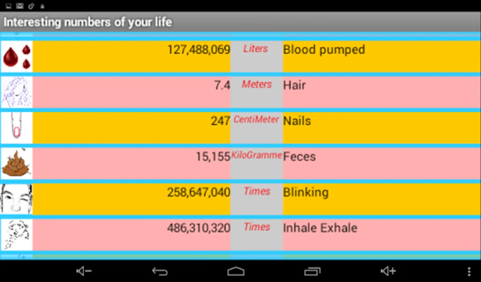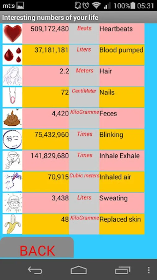 Enter Date of birth and App will show you the incredible detals of your life. App explains how your body is the perfect machine. Funny, educationnal, interestingly.Incredible numbers !!!:))