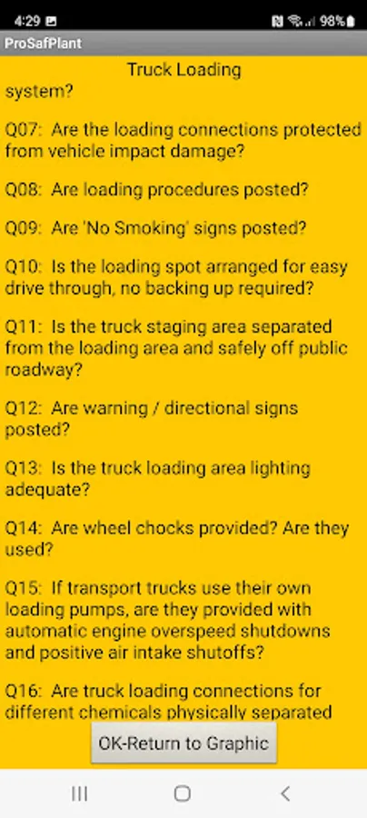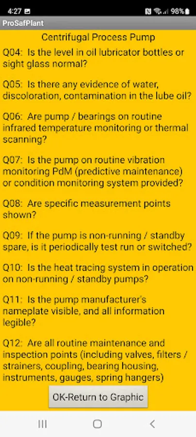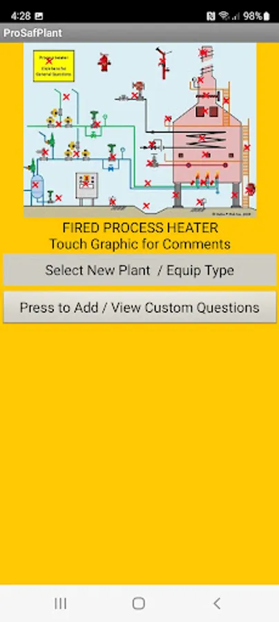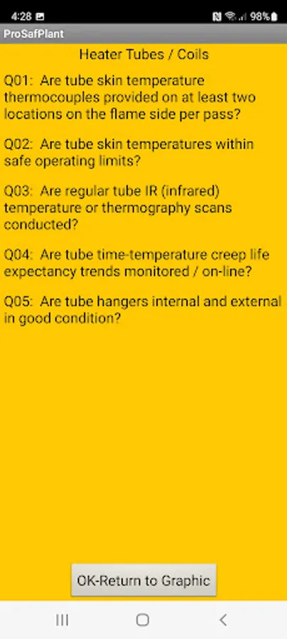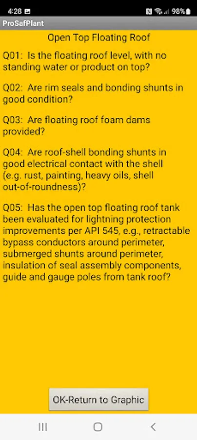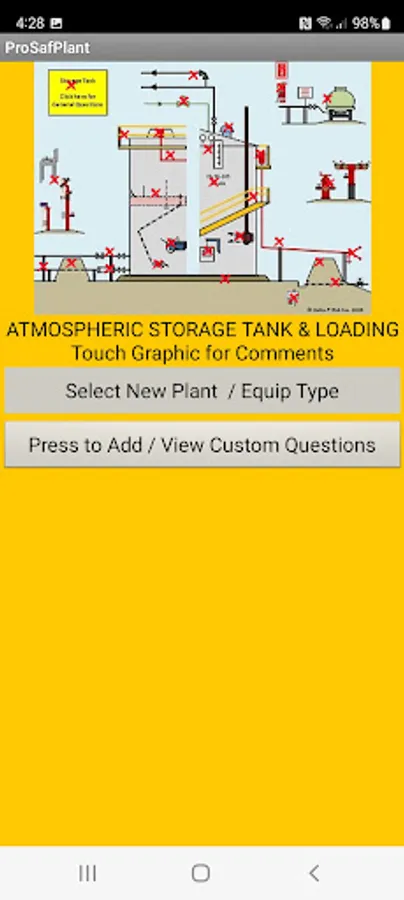ProSafPlant accesses a cloud database of over 2,500 process safety questions / inspection items in 20 different process plant / equipment modules as listed below. Users can also store their personal inspection notes on their own device or submit them for inclusion in the global questions database to benefit all app users.