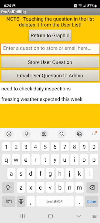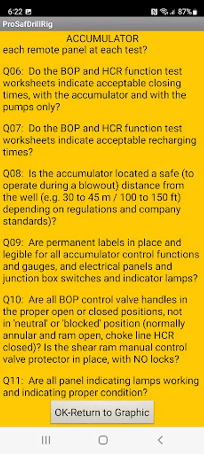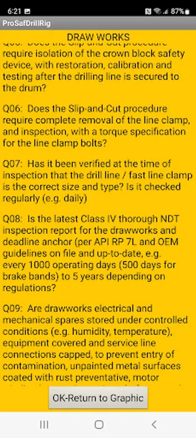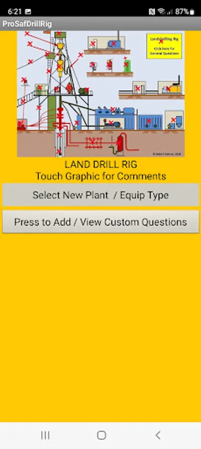 ProSafDrillRig accesses a cloud database of over 580 questions / inspection items in 29 equipment / area categories. Users can also store their personal inspection notes on their own device or submit them for inclusion in the global questions database to benefit all app users.
