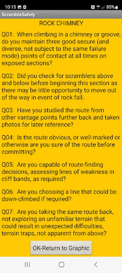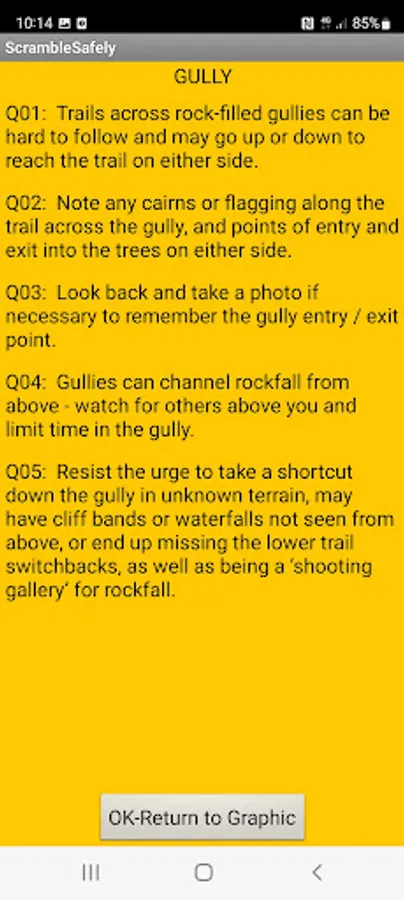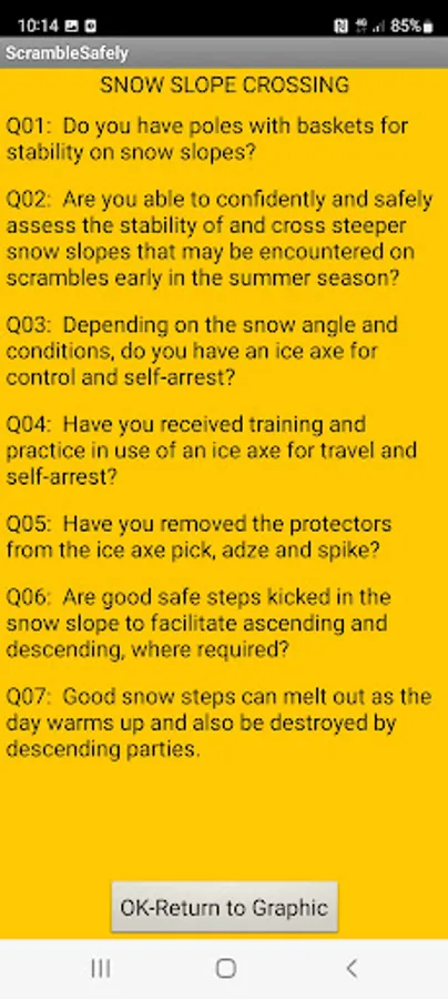 ScrambleSafely accesses a cloud database of mountain travel safety questions and comments in 6 modules; Gear, Fauna & Weather, Approach Trails, Snow Slopes, Steep Rock and Mountain Ridges. It is intended for Canadian Rockies area scrambling. Users can also store their personal safety notes on their own device or submit them for inclusion in the global questions database to benefit all app users.