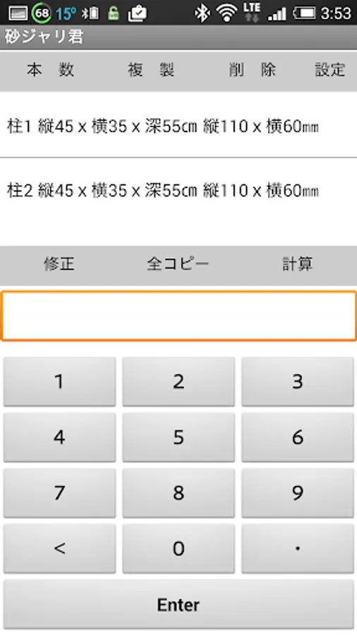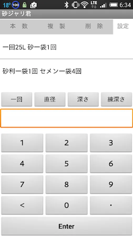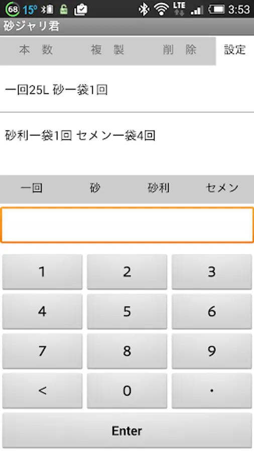 初めに設定から、いつもお使いの練り容器(一斗缶バケツ・練り樽)での、一回に練れるコンクリ量(リットル)、砂・砂利・セメントについてそれぞれ一袋で何回練れるか(1.3と入れると3袋で約4回、1.5なら2袋で3回練れるという意味になります)を設定します。