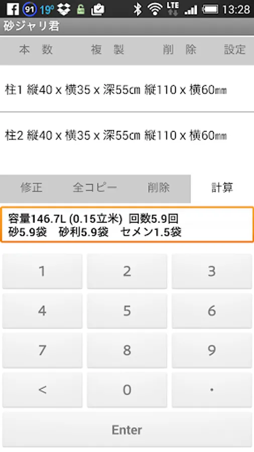 何回練るか、砂・砂利・セメンが何袋必要かを表示します。