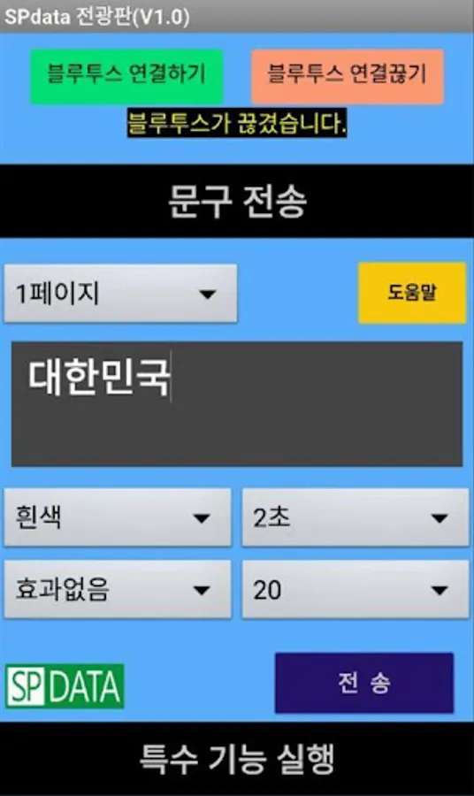 에스피데이타(spdata)가 제작한 LED 전광판에 블루투스 통신으로 최대 10개의 문구를 전송하여 순서대로 표출할 수 있습니다.