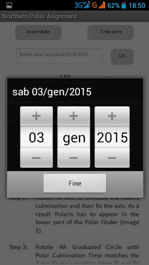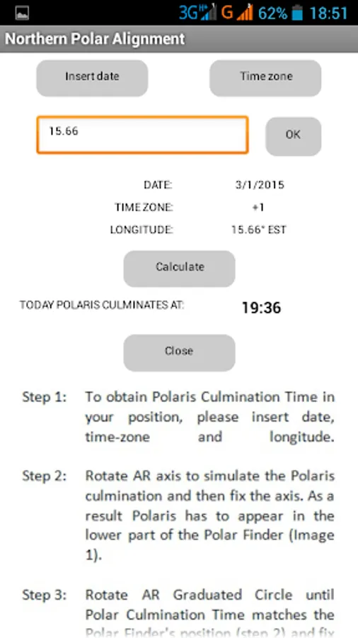 Step 1: To obtain Polaris Culmination Time in your position, please insert date, time-zone and longitude.